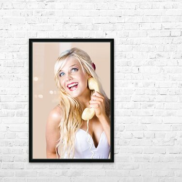 Gorgeous blond woman laughing on telephone call Frame print