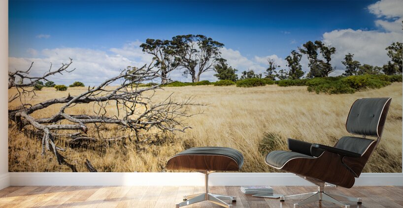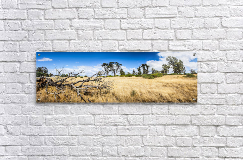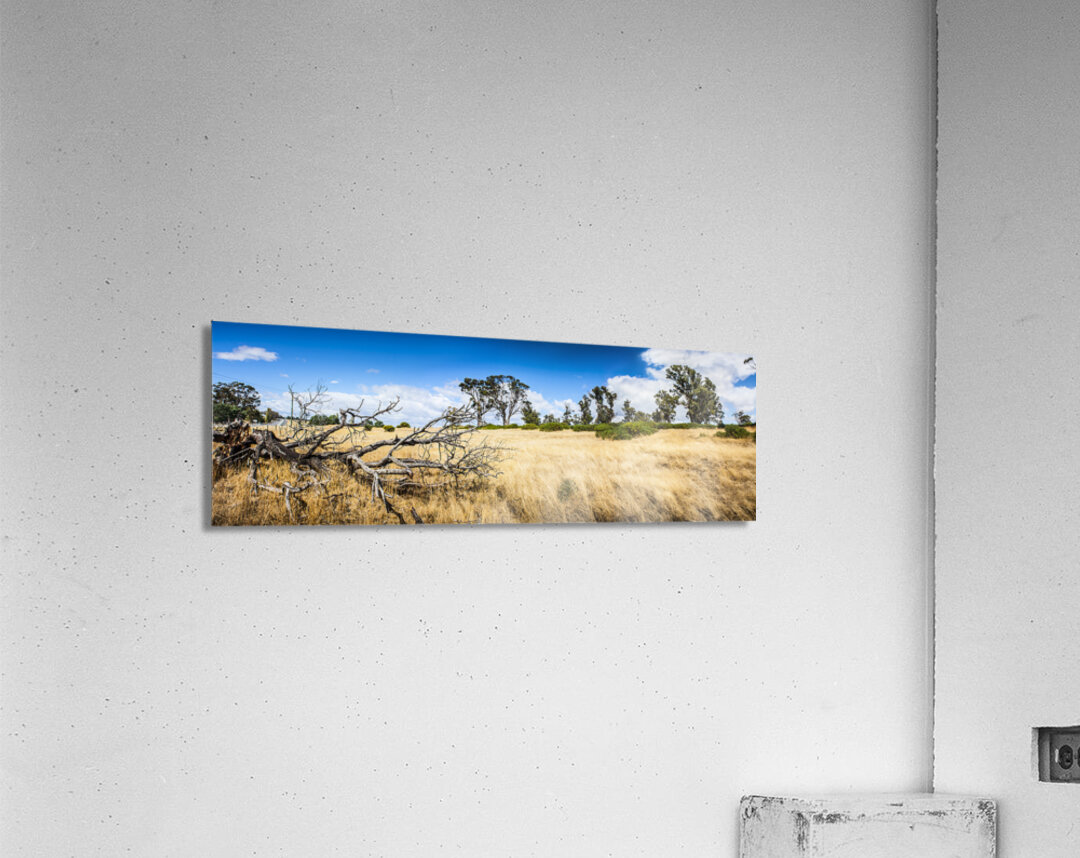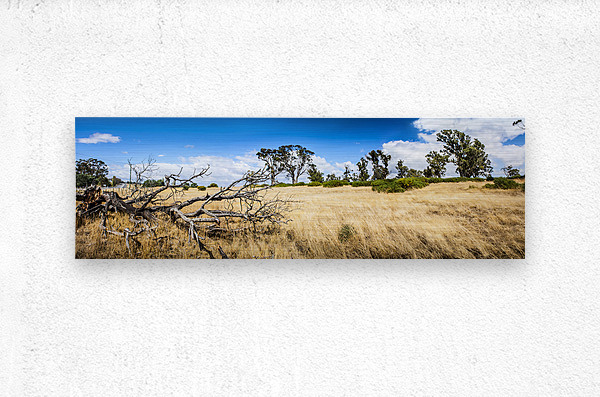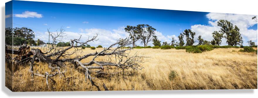 Summer landscape of the rural Tasmania outback with dead fallen tree and dry grass 3 image photo-stitch taken North Hobart Australia