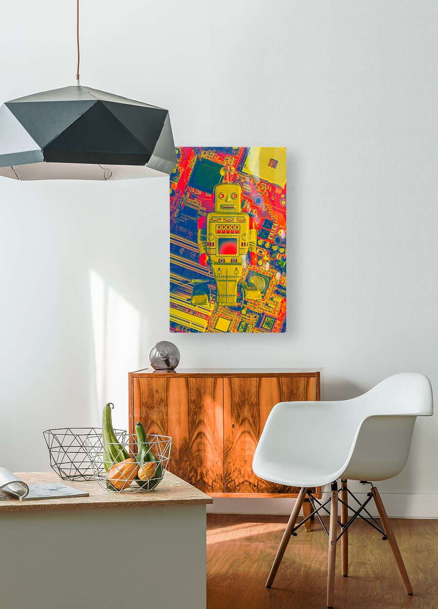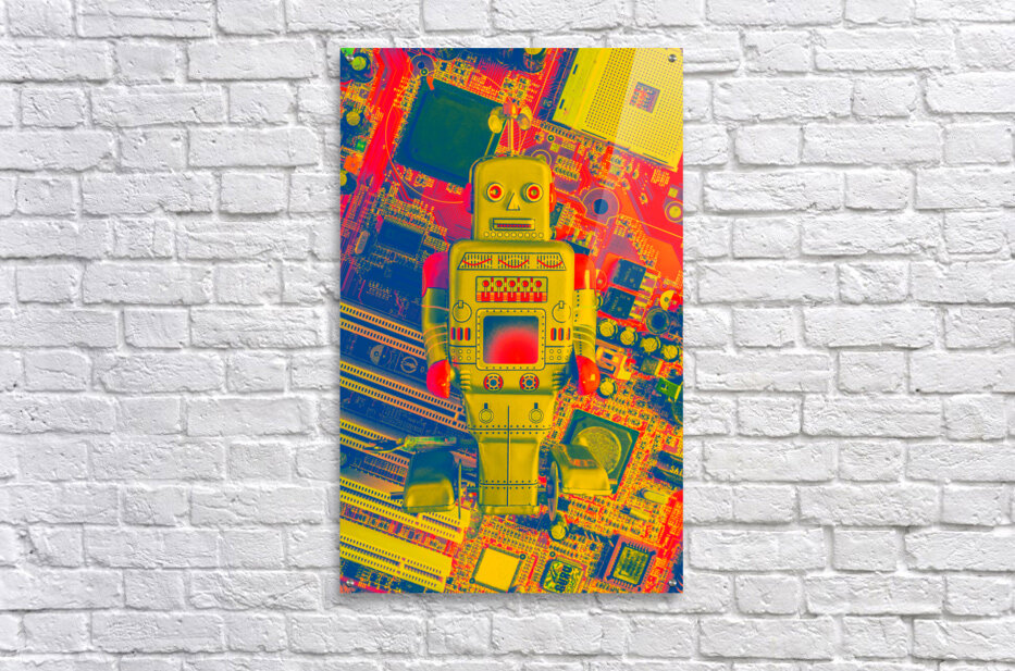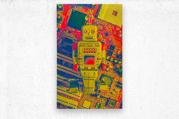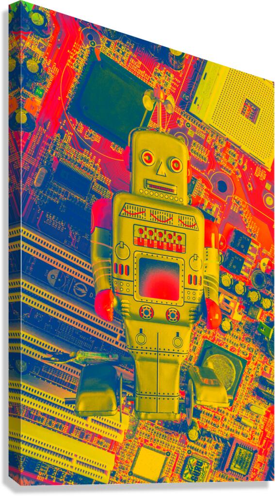 A playoff in gaming mechanics with tin toy robot rebooted in the vintage games room