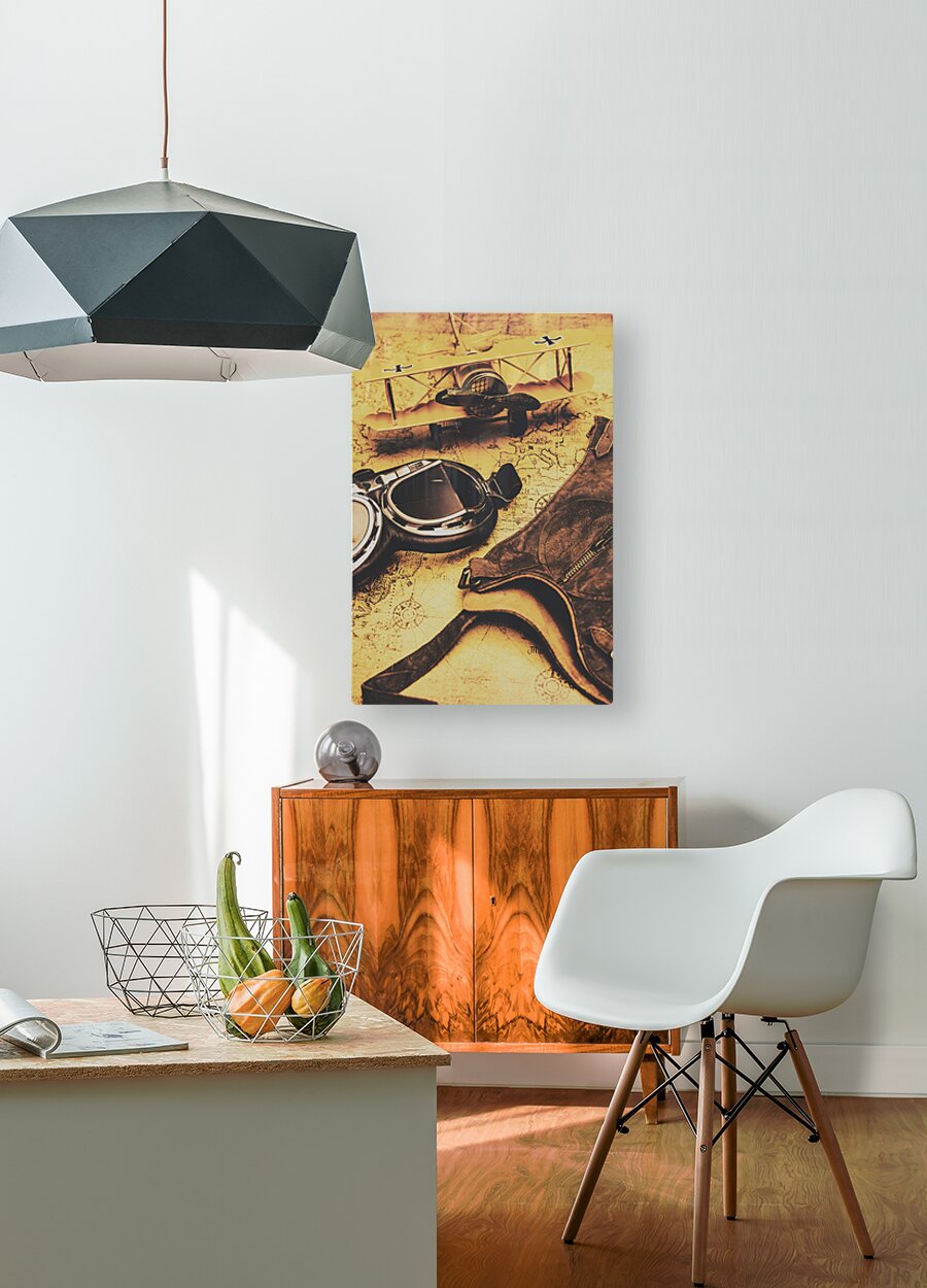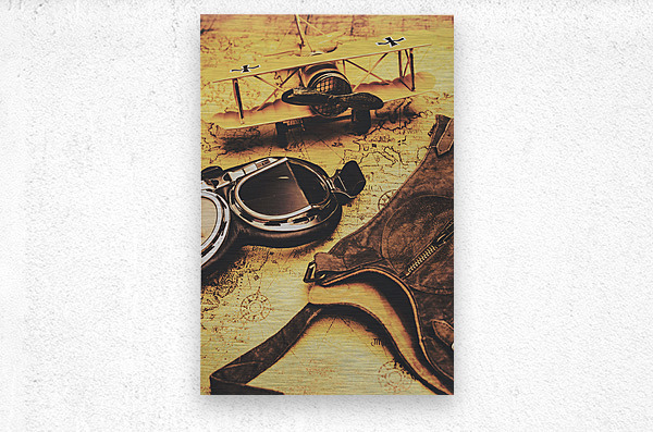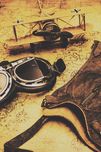 ABOUT THIS ARTWORK: AVIATOR GOGGLES CAP AND AIRPLANE ON OLD WORLD MAP