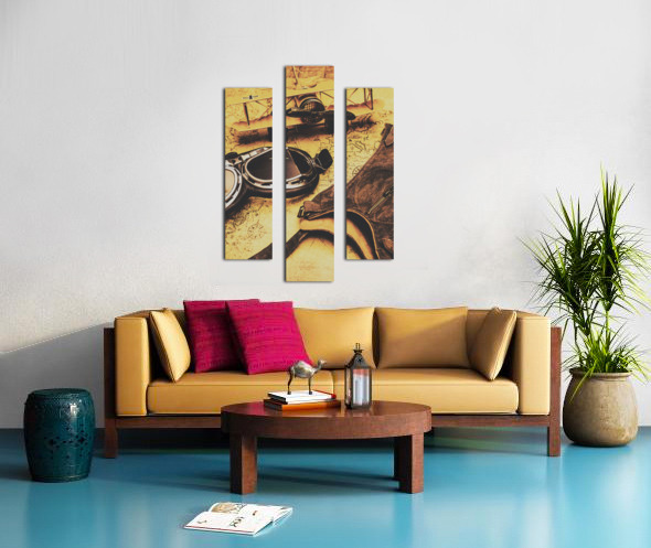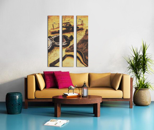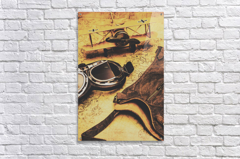 Get this artwork "Aviator goggles cap and airplane on old world map" in a framed print.