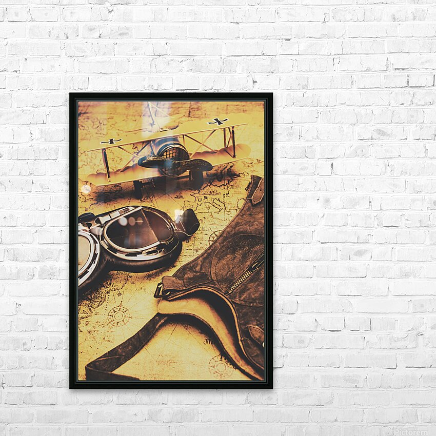 Aviator goggles cap and airplane on old world map Picture Frame Printing