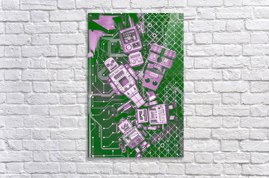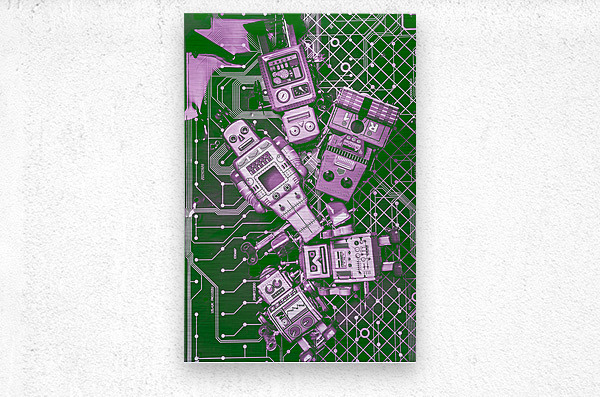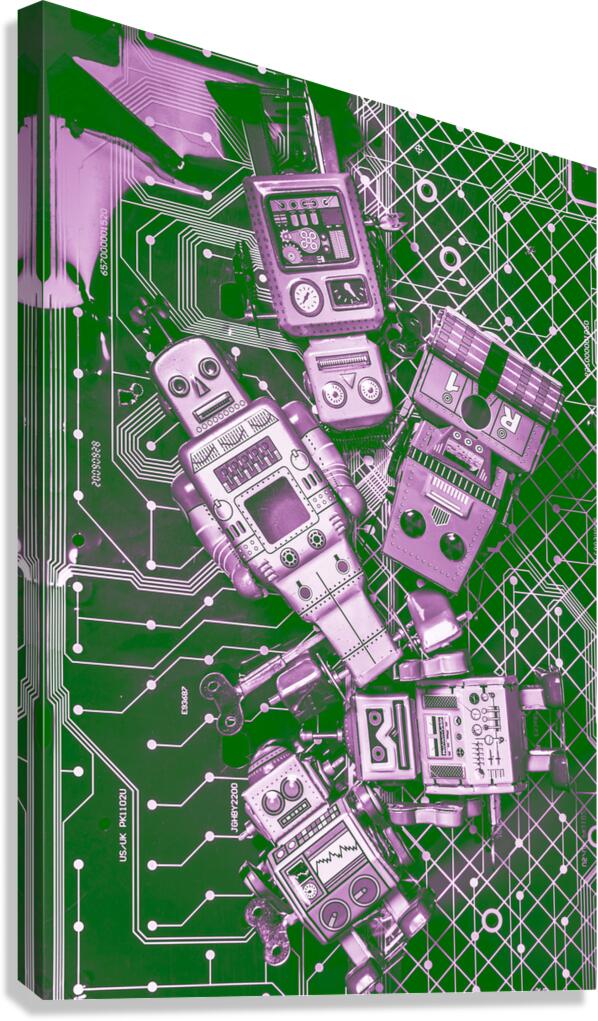 Creative still life artwork on a programming of prototype retro robot toys on electronics background. Tech borg centre