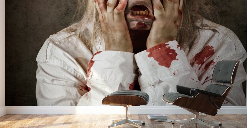 Grunge portrait of a shocked bloody female business zombie with hands to decaying face and maggots crawling from eye-socket. Shock horror concept