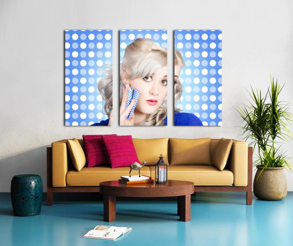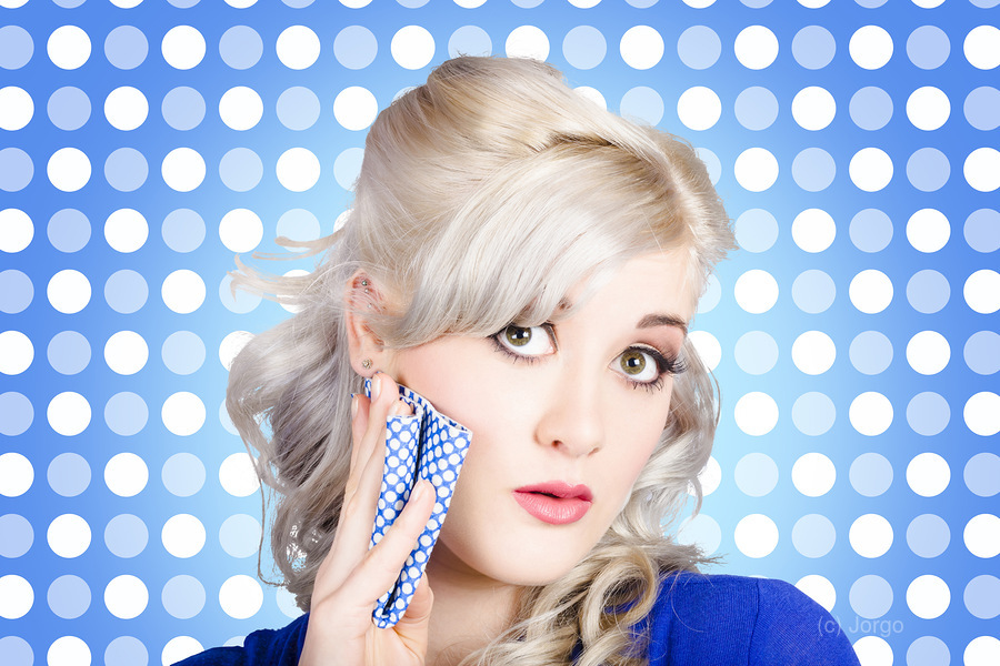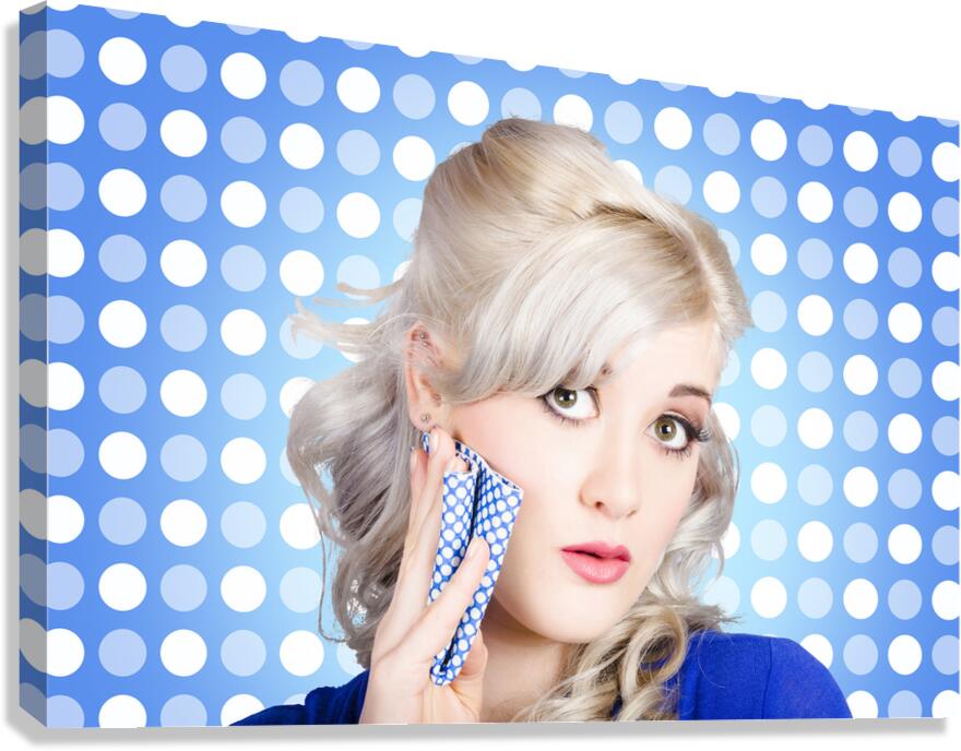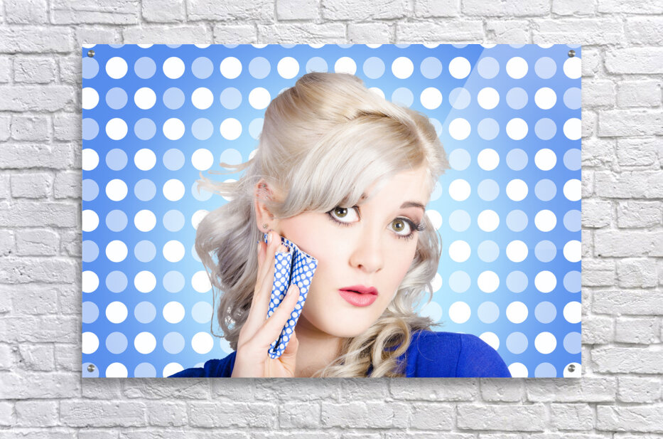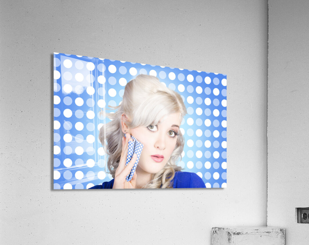 Face of a vintage woman from 1950 holding cleaning rag with surprised expression. Retro cleaning advertisement on polka dot design background