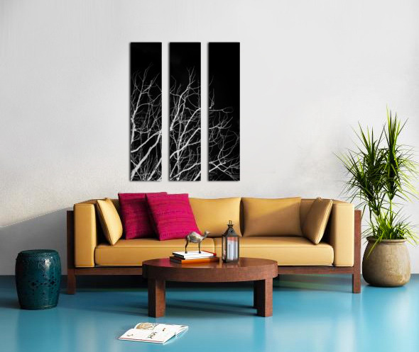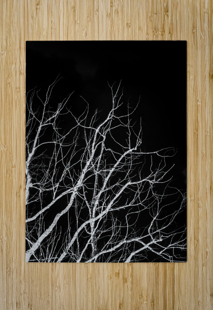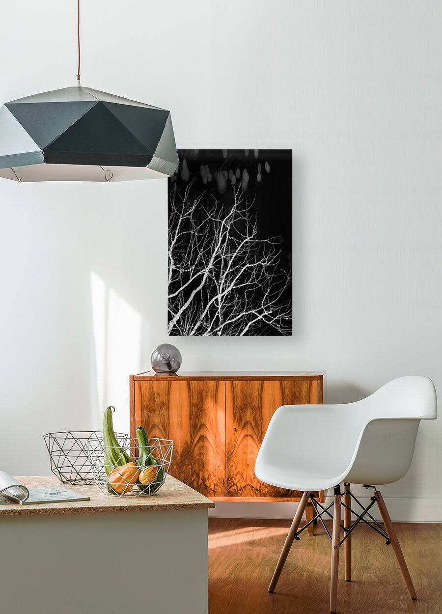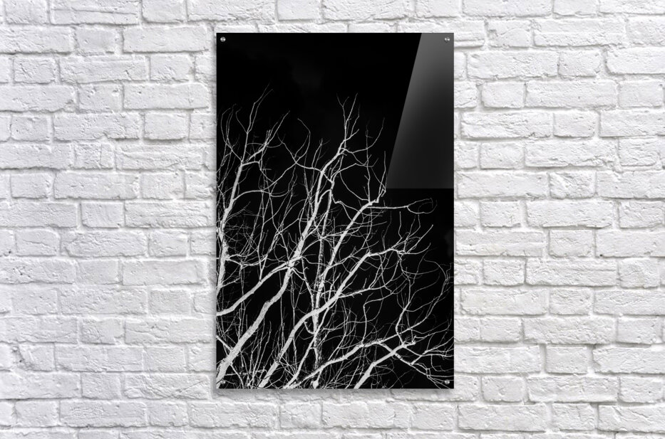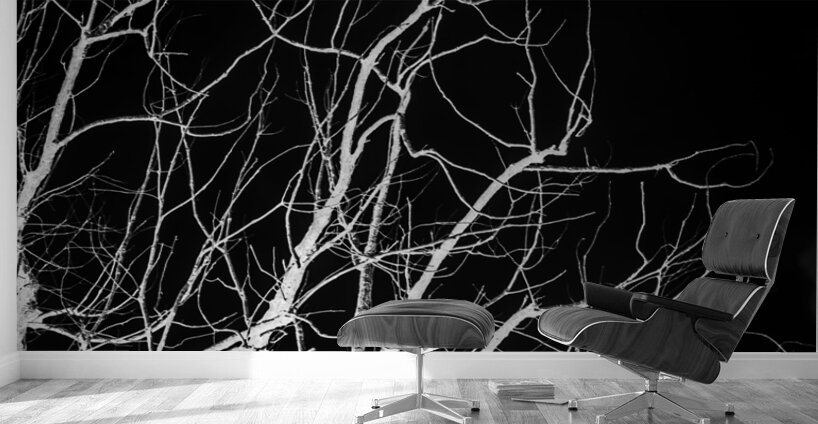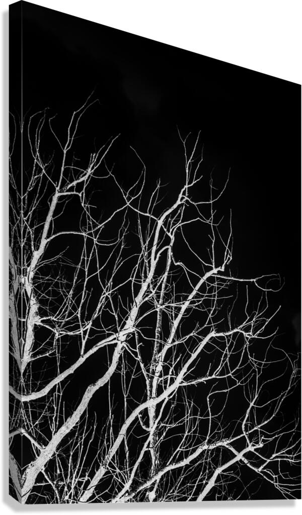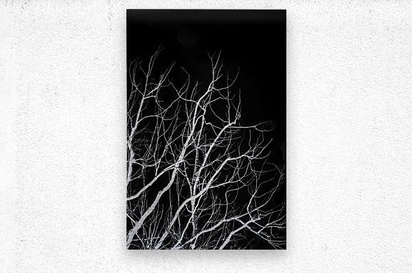 Black and white nature artwork on a leafless trees branching into dark skies. Winters bare