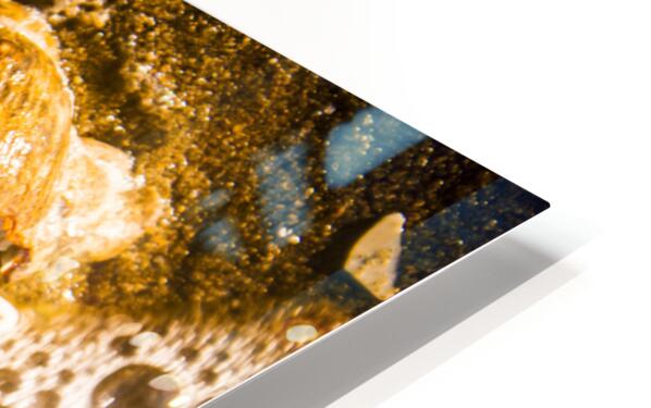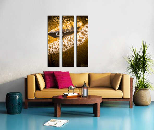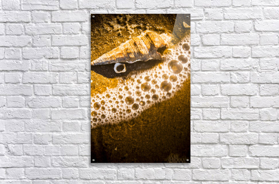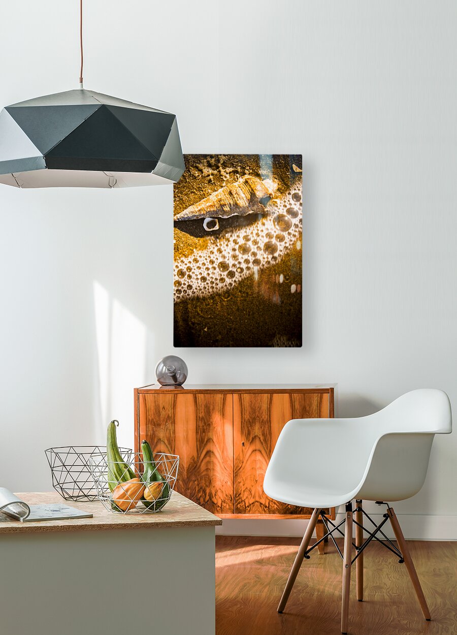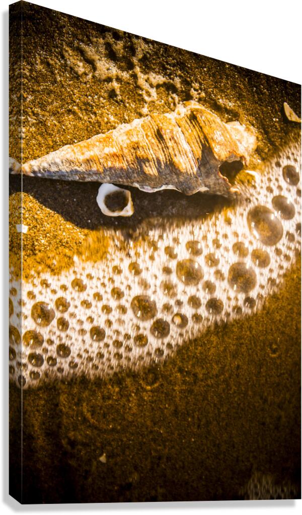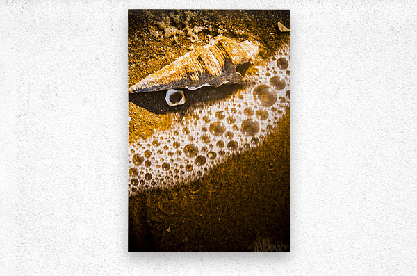 Nautical orange fine art image of a seashell meeting the bubbles of an incoming tide. Waves and tidelines