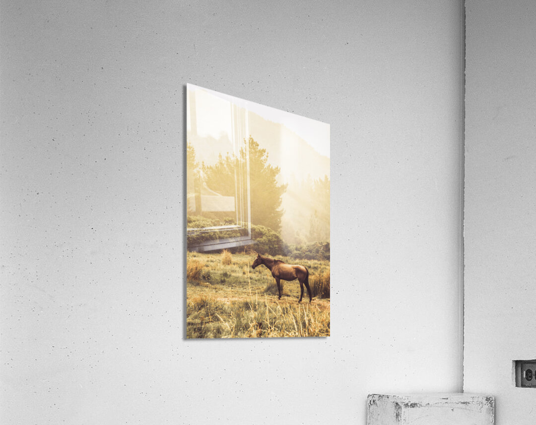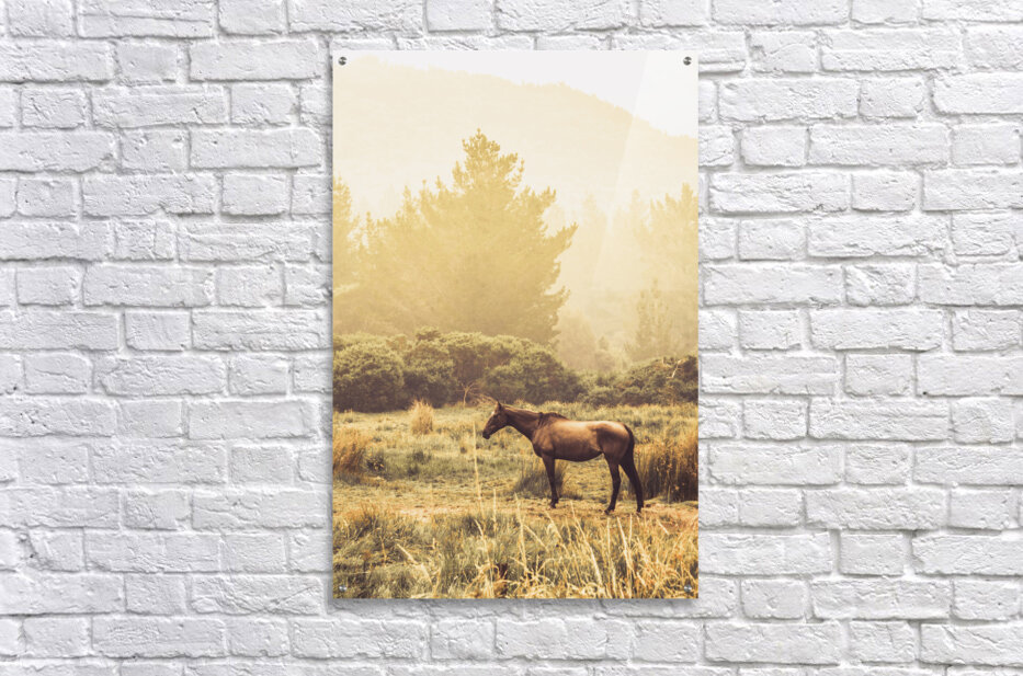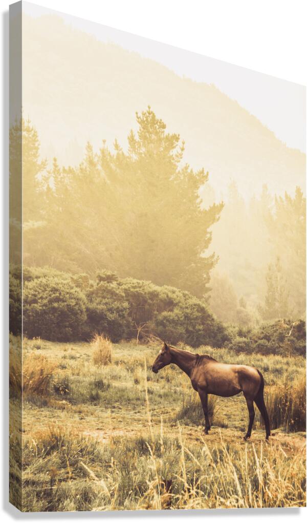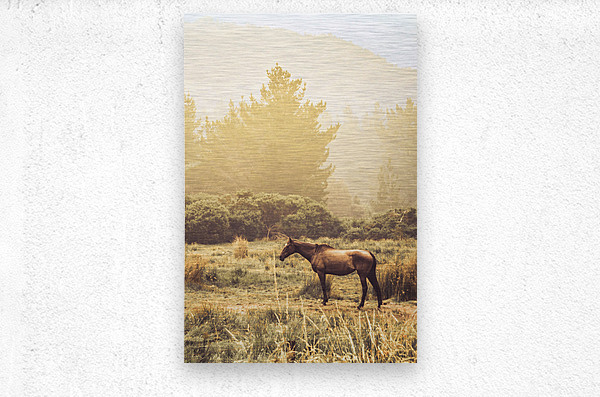 Idyllic pasture scene on a horse grazing in a remote west coast Tasmania morning field. Captured Western Zeehan Australia