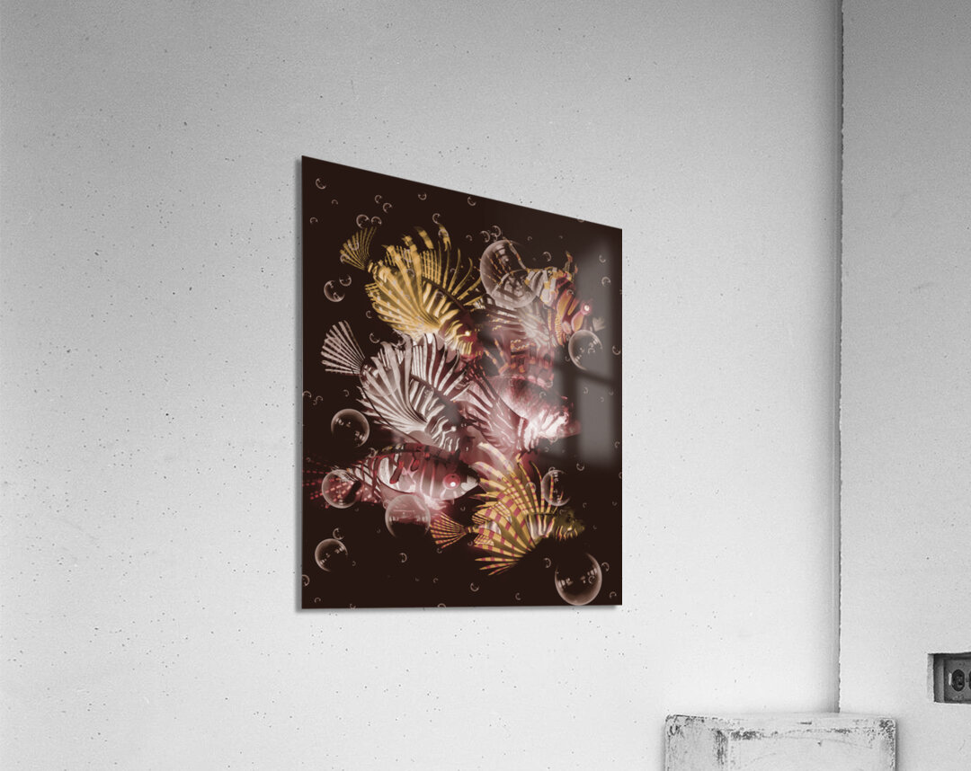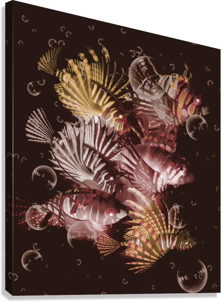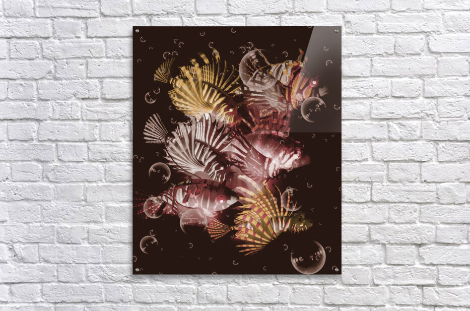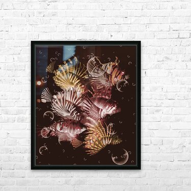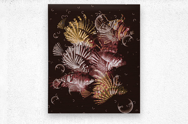 Dark maroon artwork on a school of lionfish abstracted by bubbles in creative seas. Exotic depths