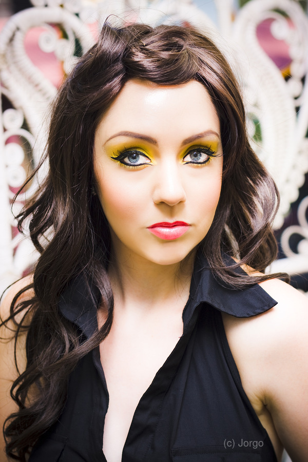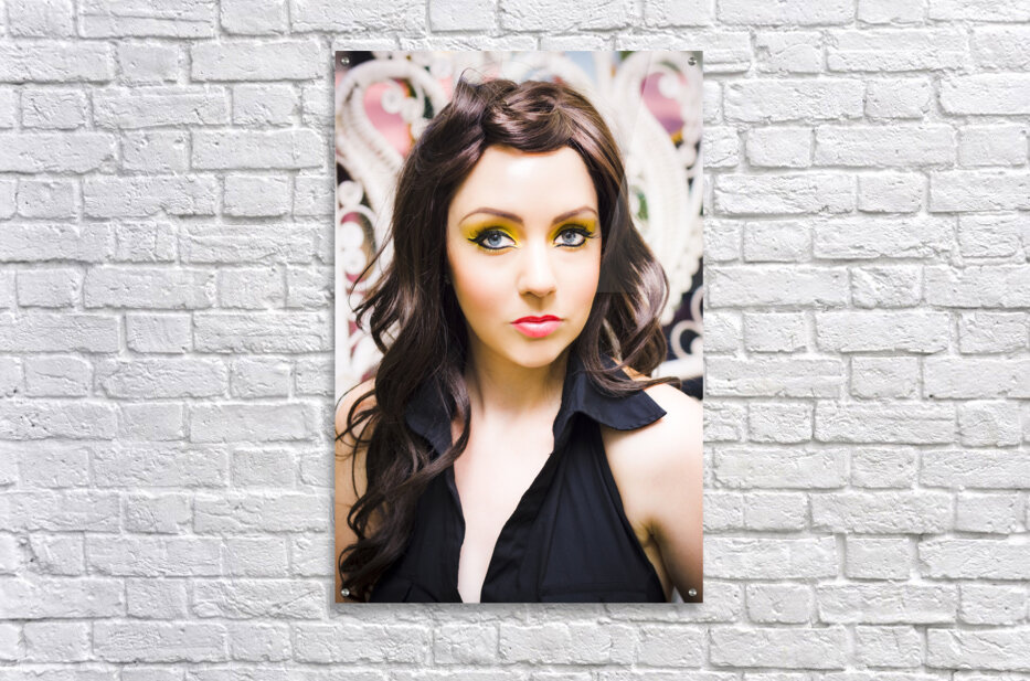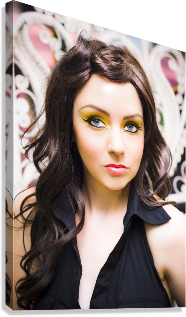 Beautiful Fifties Era Retro Photograph Taken Indoors Of A Elegant And Stylish Female Brunette Model With Blue Eyes And Yellow Make Up With A Sensual Expression