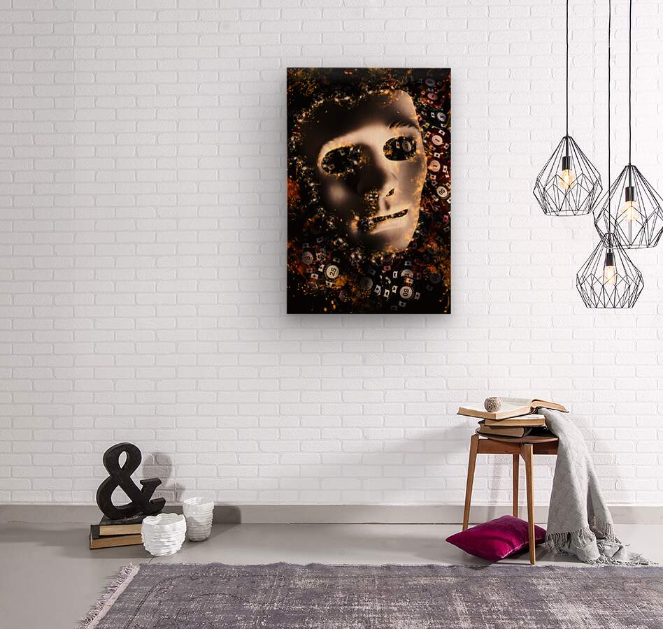 Artistic design on a fired up still life scene of winning wagers with the mask of a poker ace with straight laced poker face