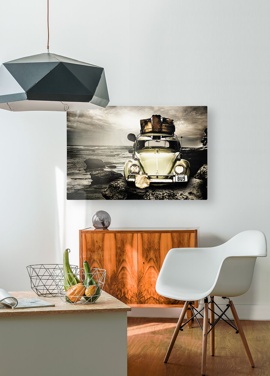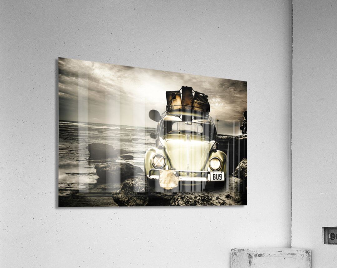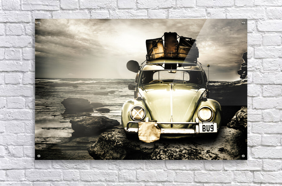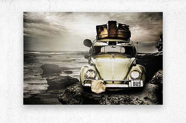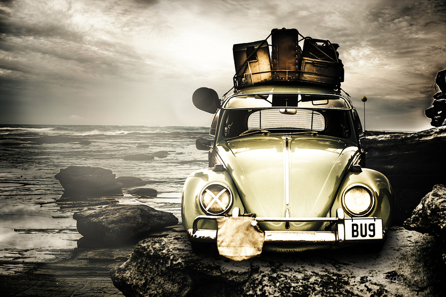 Vintage 1960 VW Beetle on a rocky Australian landscape coast packed to the rafters with vintage luggage. The travel bug