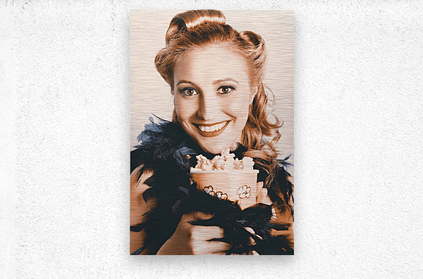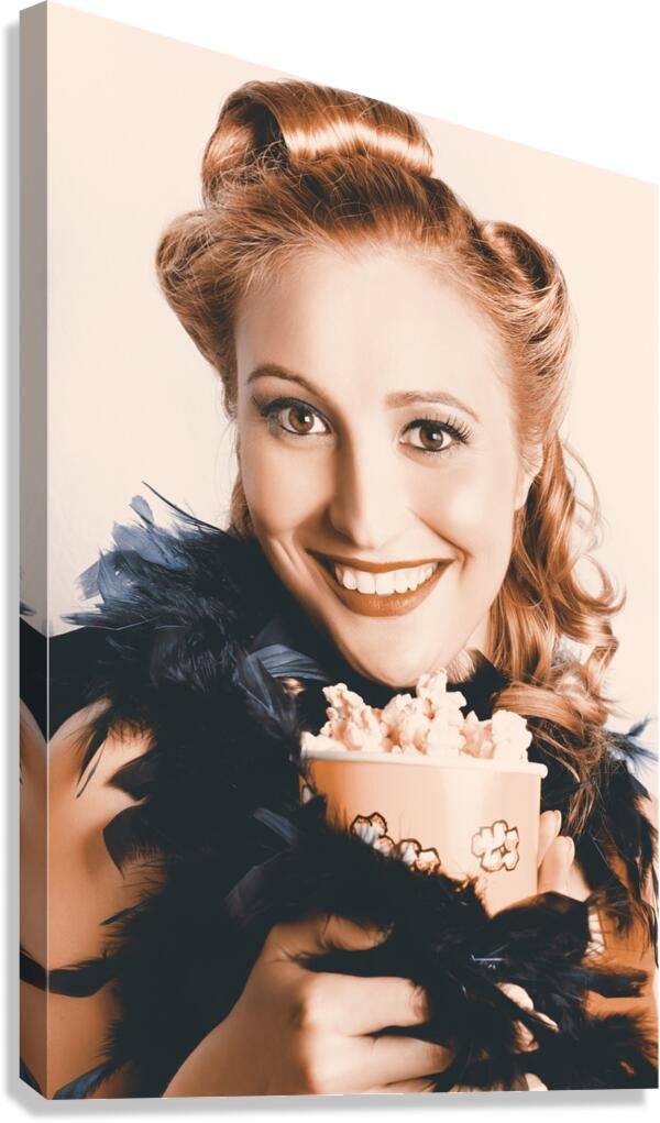 Fifties Pinup Woman Holding Old Popcorn Box Overflowing With Buttered Popcorn When Seeing A Classic Movie In A Depiction Of The Retro Cinema Era