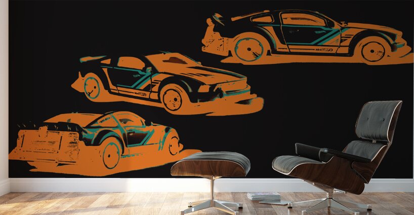 Comic book styling in a drift of 2005 Mustang muscle cars in posterized cartoon photograph. Mustanged