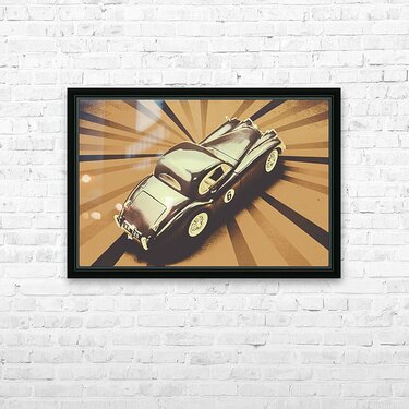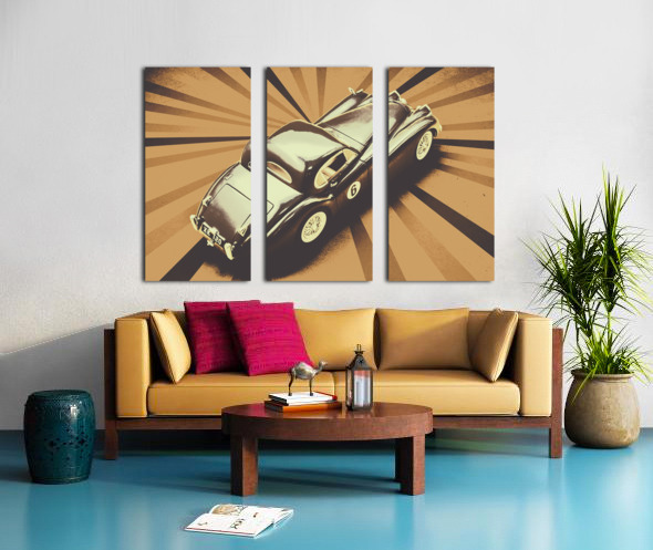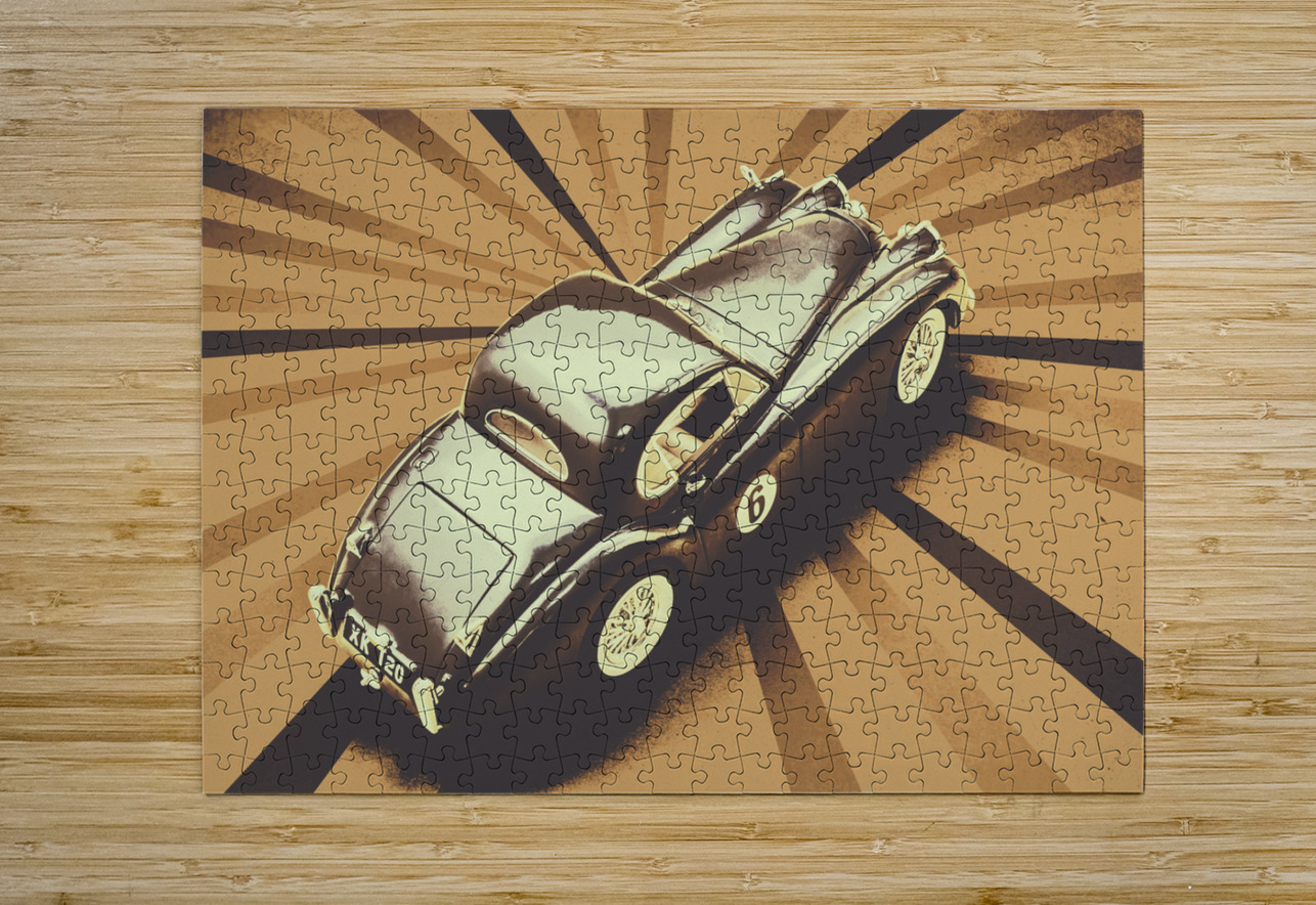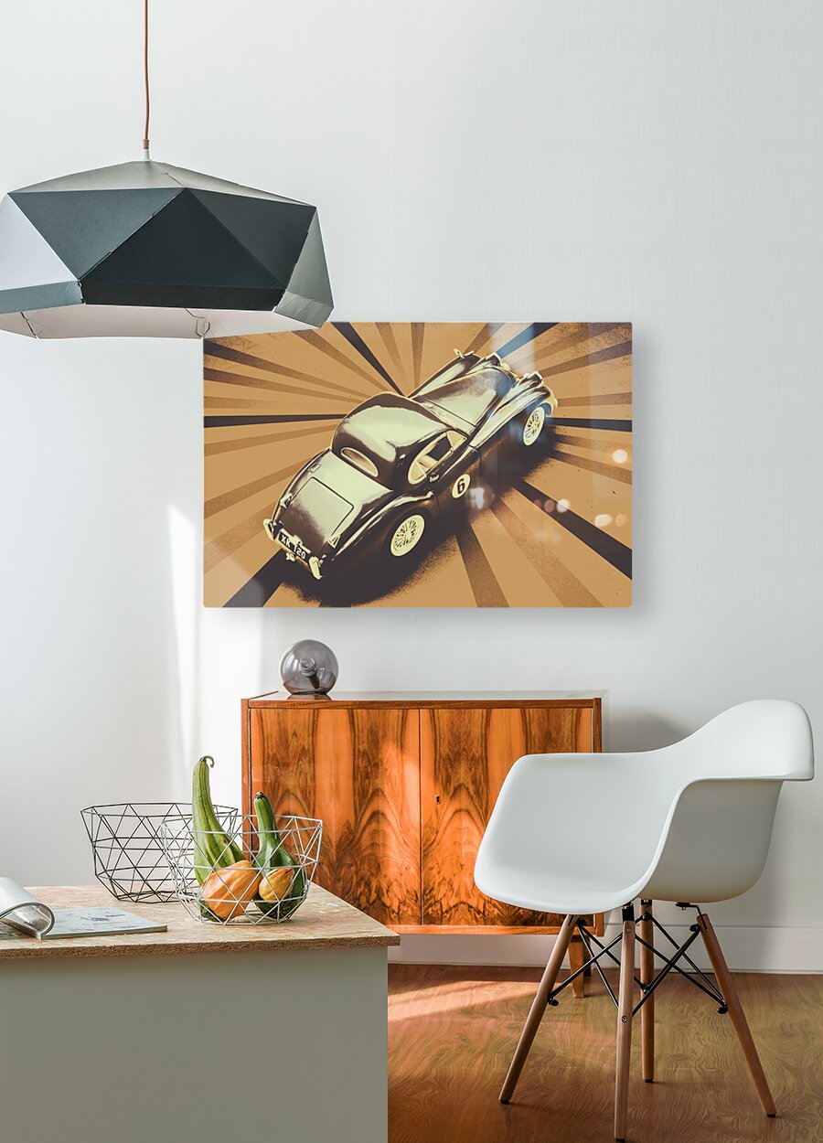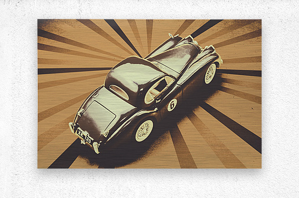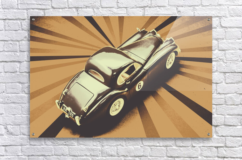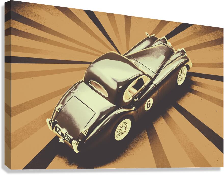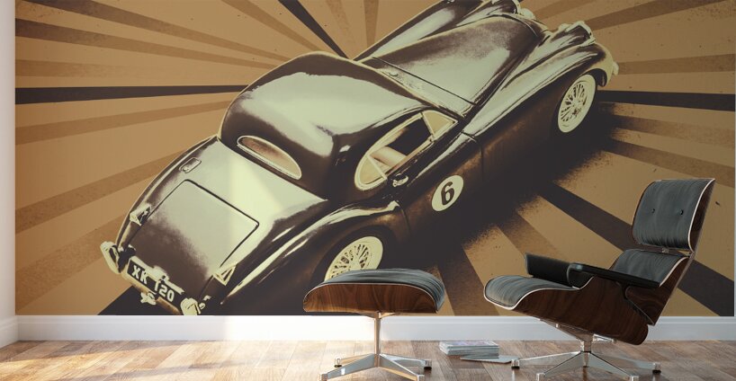 Vintage car art on a forties Jaguar XK120 classic car on traditional starburst background. Return of the XK120