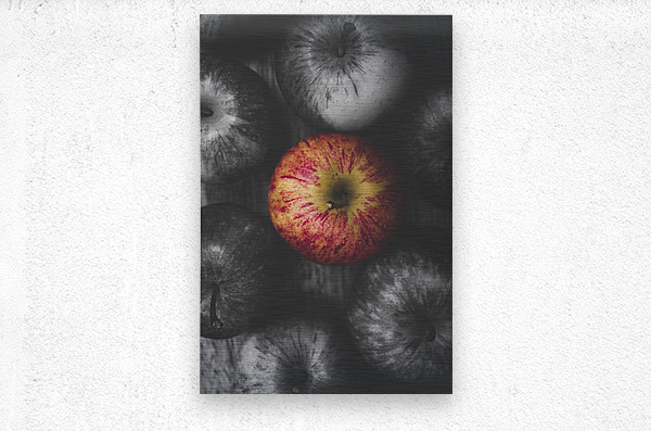 Top view of black and white apples with standout single red as highlight