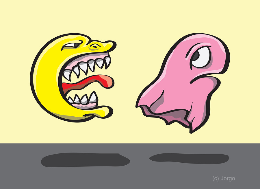 Sinister computer gaming Pacman chasing down Ghost with gnashing sharp teeth in arcade labyrinth. Gaming illustrations