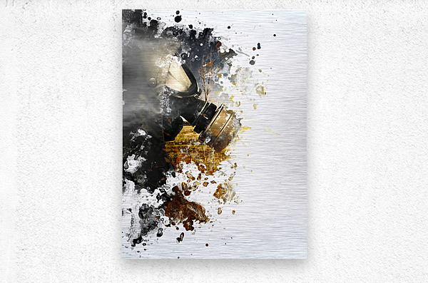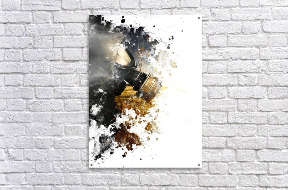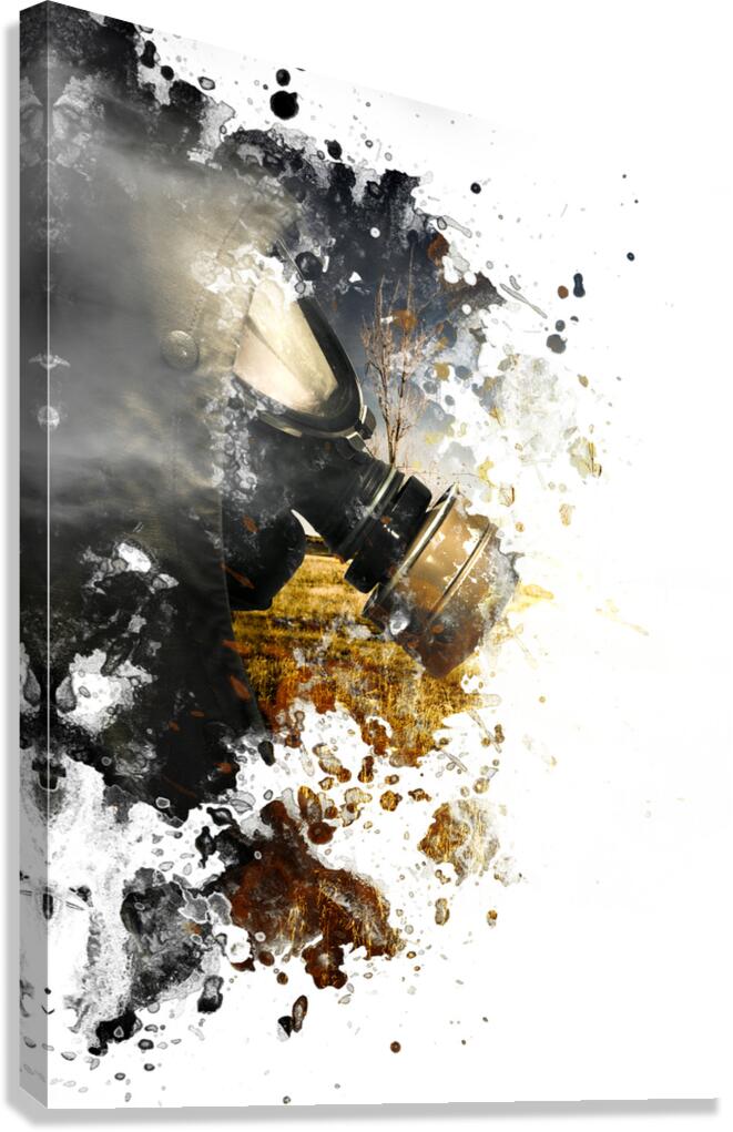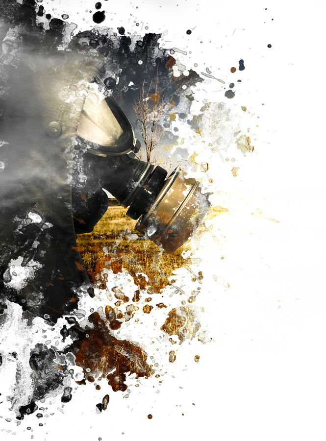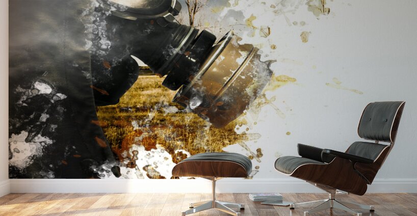 Photo painting of a war torn soldier walking into paint stained copyspace wearing gas mask. Chemical destruction