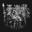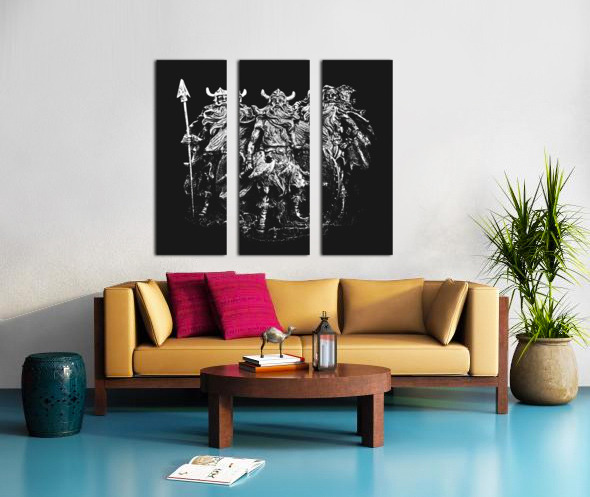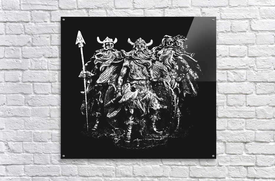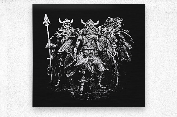 Historic art on sculptures of Scandinavian strength with a small tribe of viking warriors dressed in combat attire laying siege under black skies