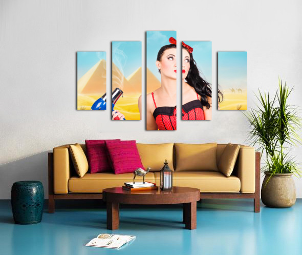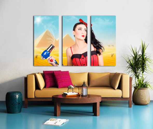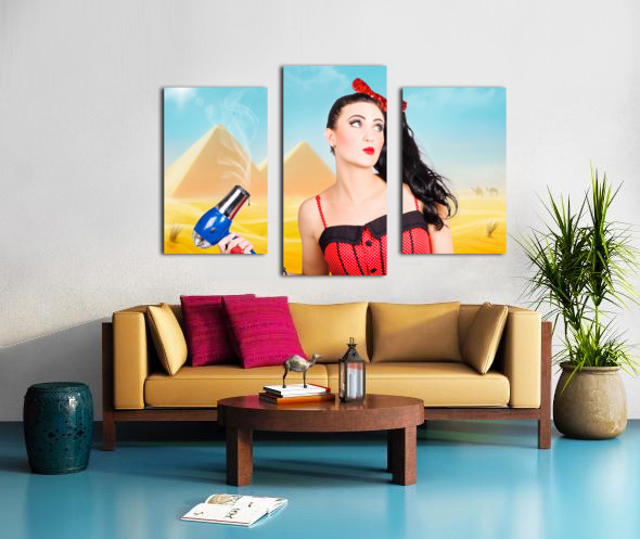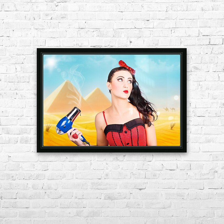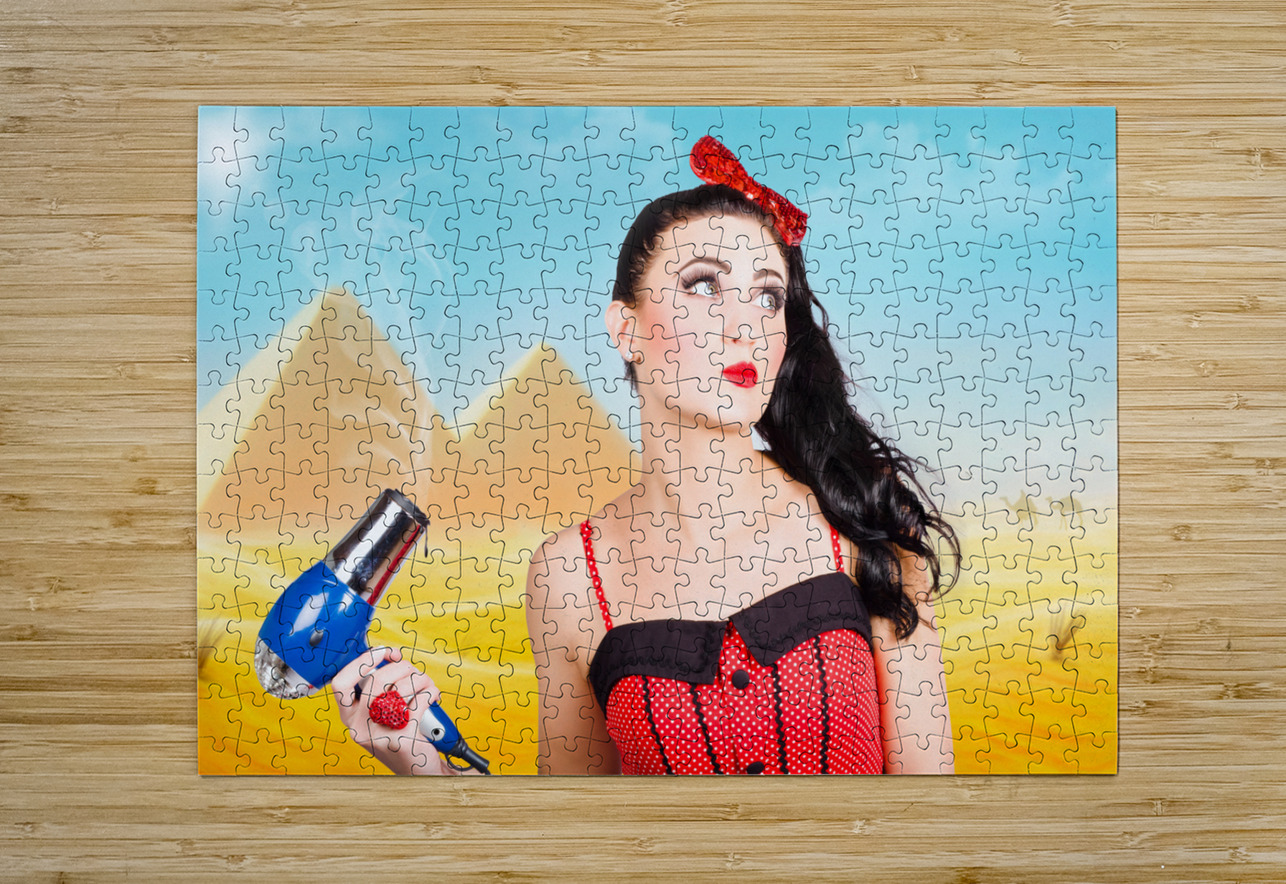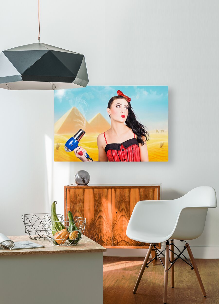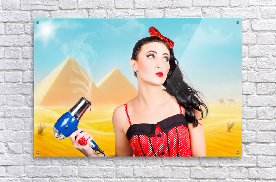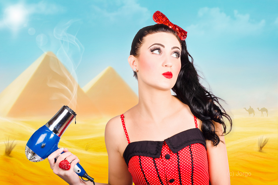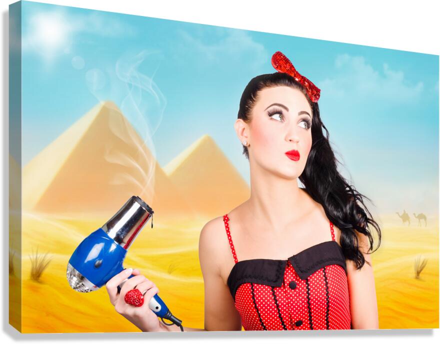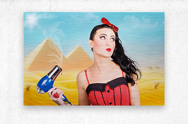 Artistic photo illustration of a scorching pin up girl standing in Egypt holding hair dryer when getting beauty styled like Cleopatra. Hot hair cut