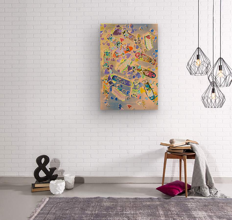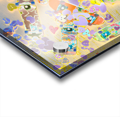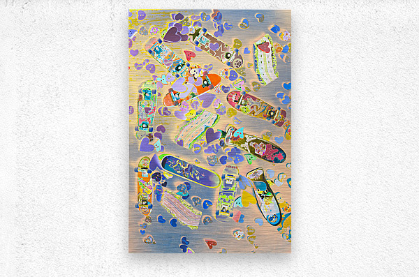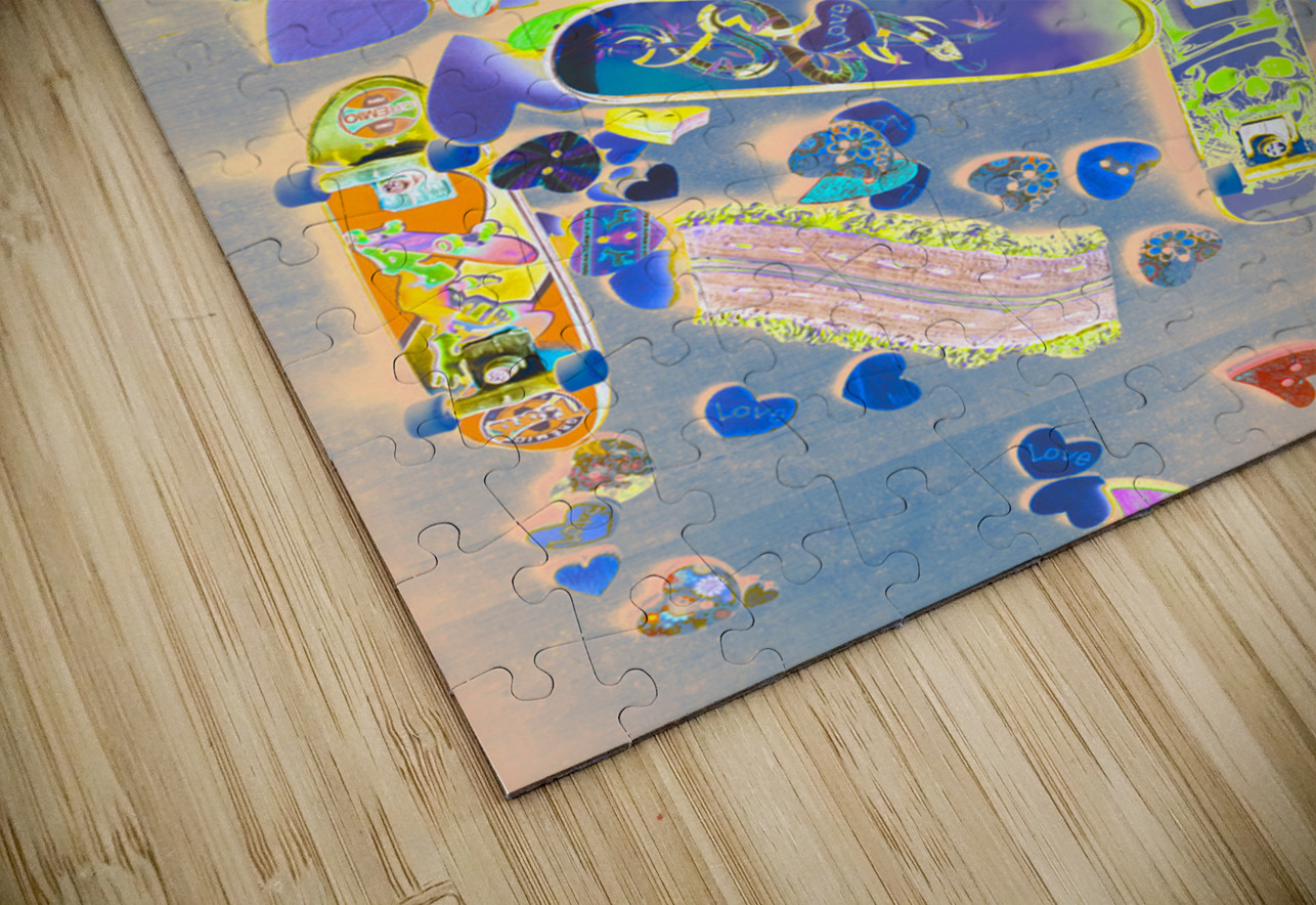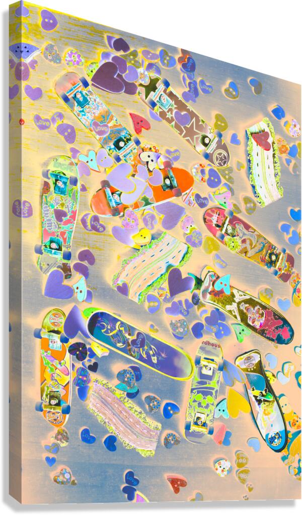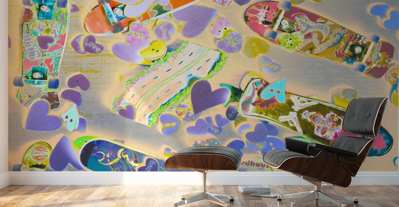 Abstract pop art scene on a mixture of love hearts motorways and toy skateboards. Creative skate