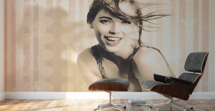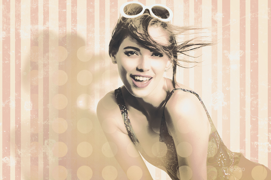 Old style edit of a hot pin up model with wind swept fringe on summer wallpaper background. Vintage female portraits