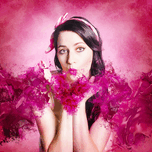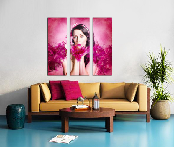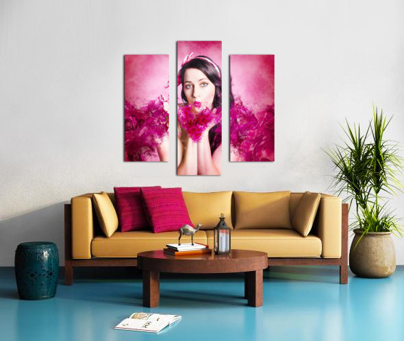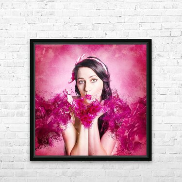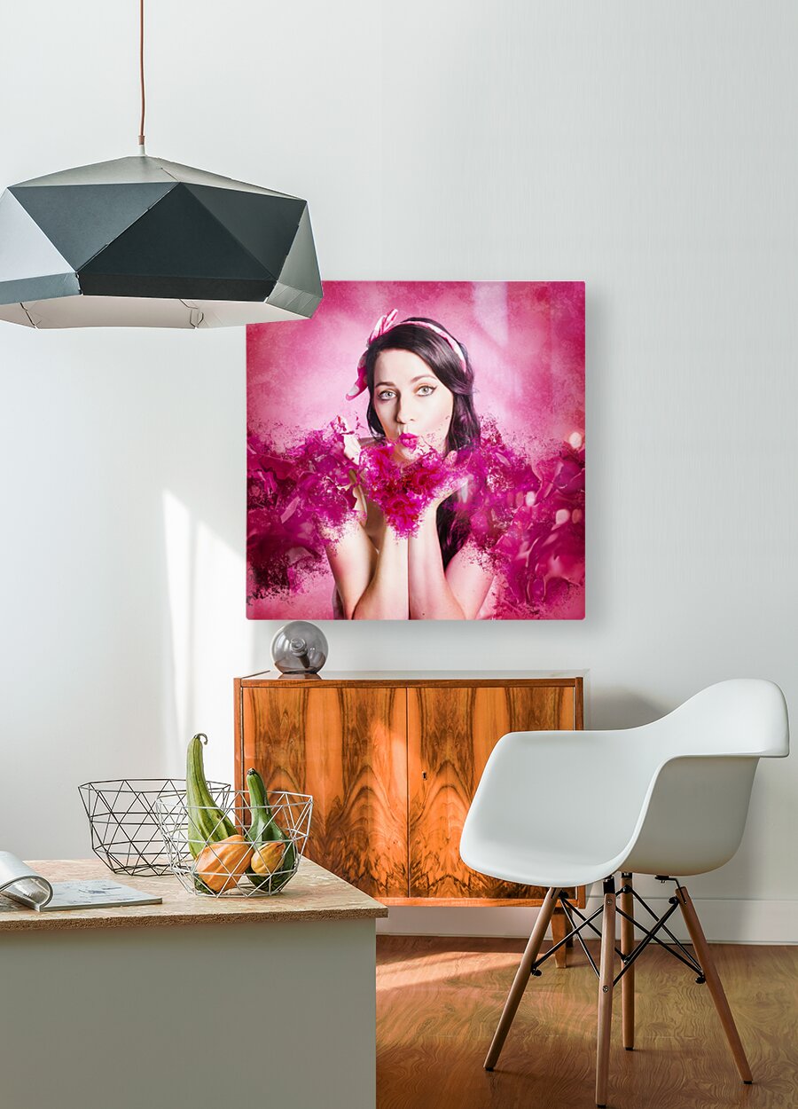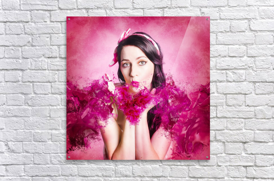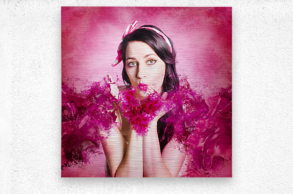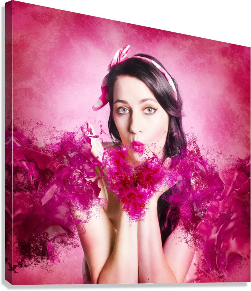 Artistic fine artwork of an attractive pinup woman blowing paint splash kisses in pink valentines day style. With love and hearts