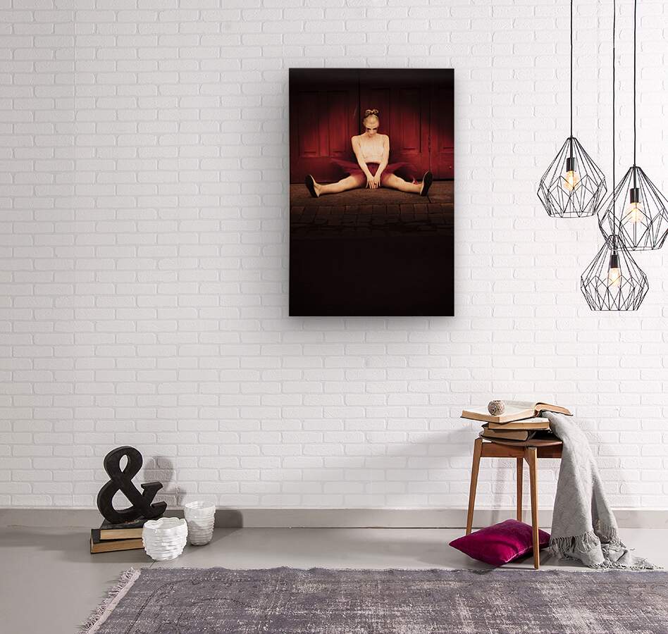 Locked Out Dancer Sits In Front Of A Big Red Door With Head Hanging Low In A Sad And Sorrowful Portrait Of Failure Loss And Suffering Text Copyspace O...[+]
