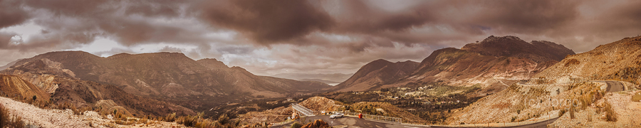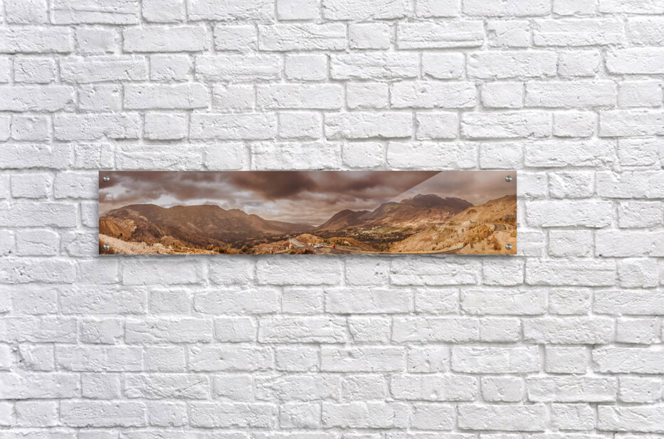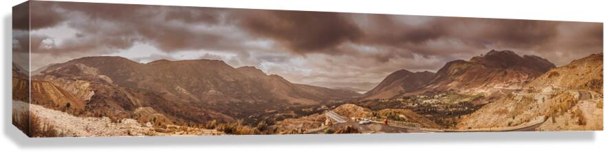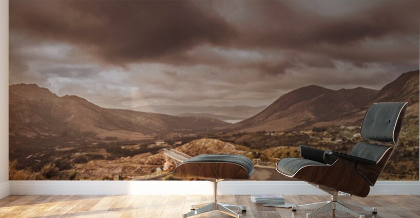 Wide angle panorama of the wonderful western wilderness captured from above Iron Blow lookout Gormanston Western Tasmania Australia