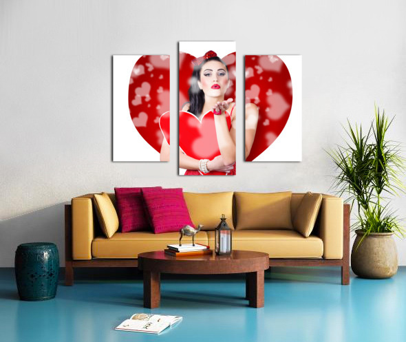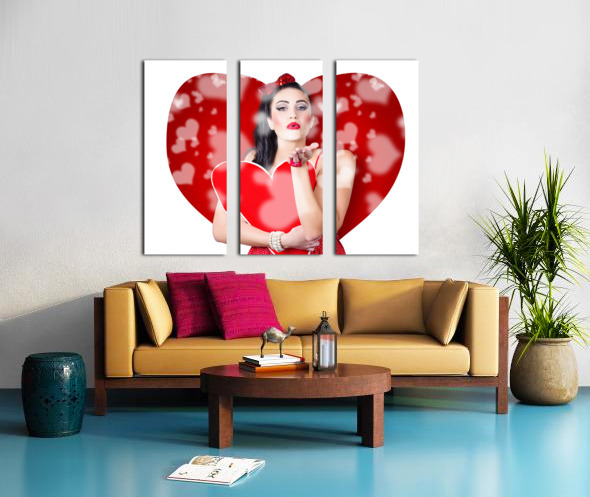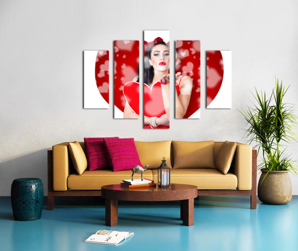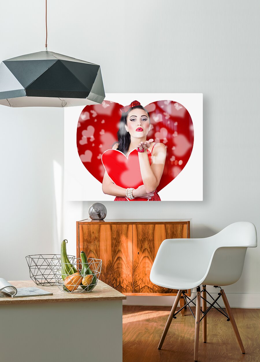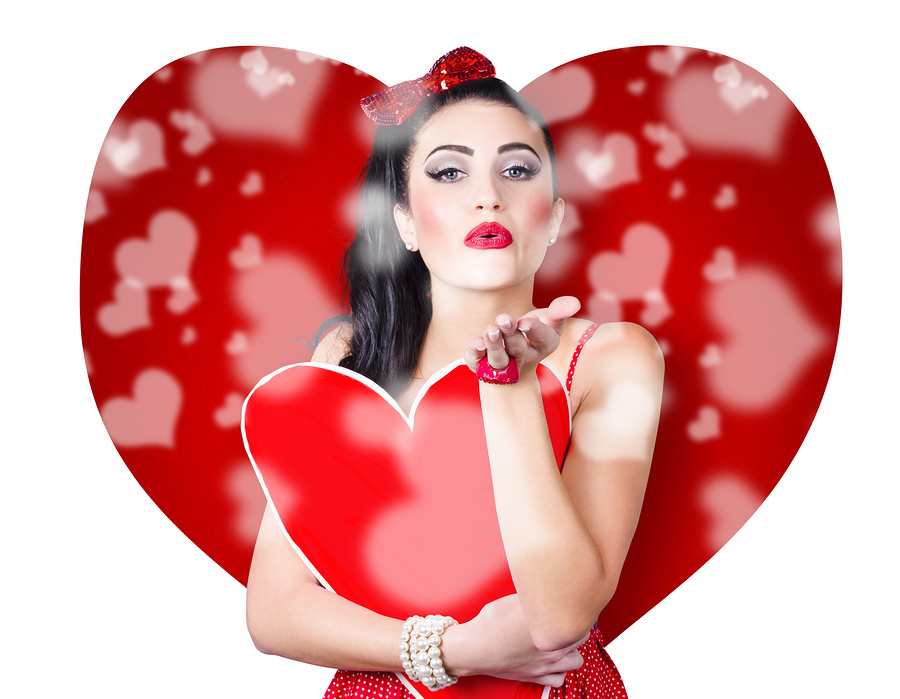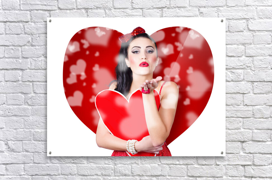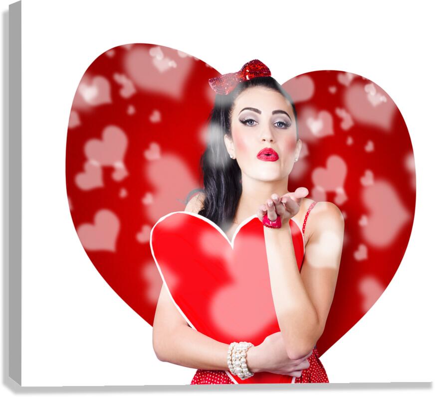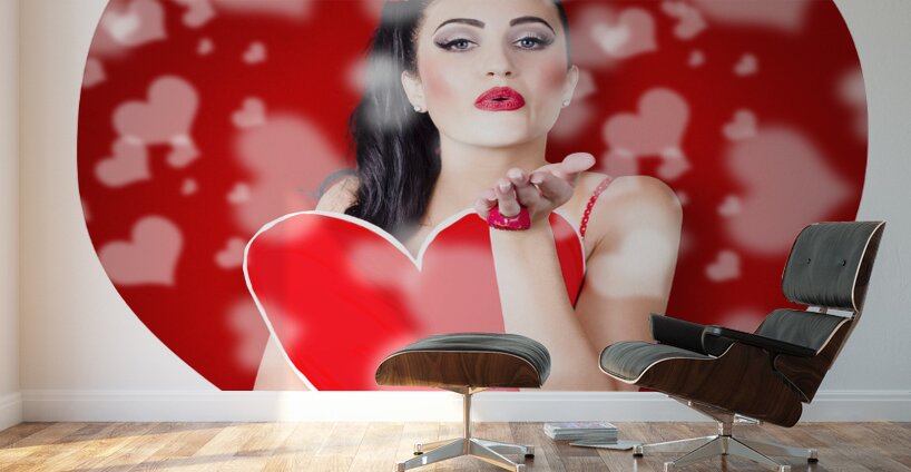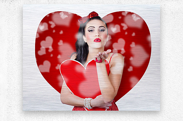 Beautiful girl in a bright love romance sending a kiss on creative hearts background