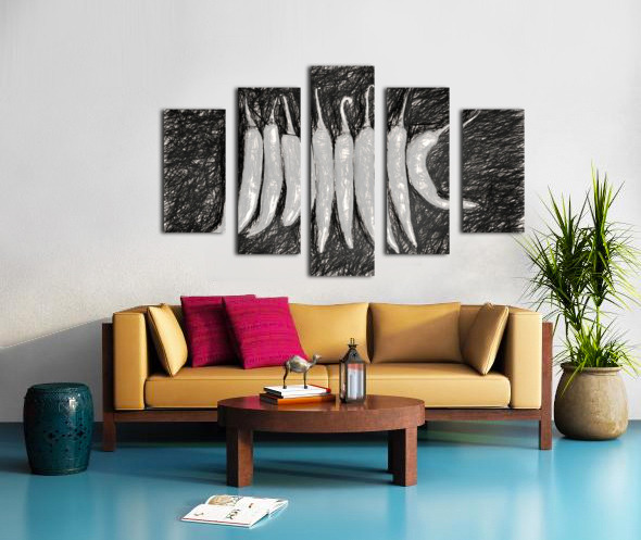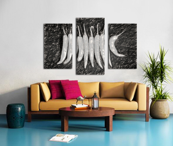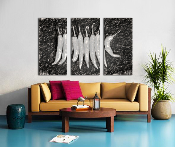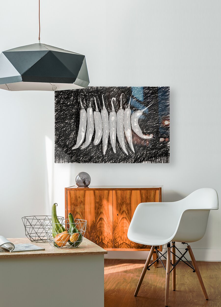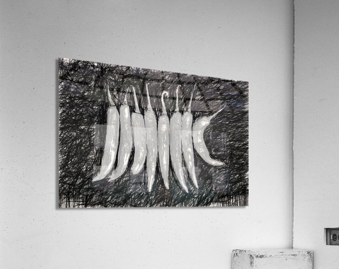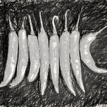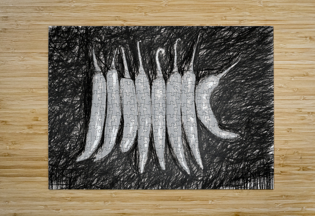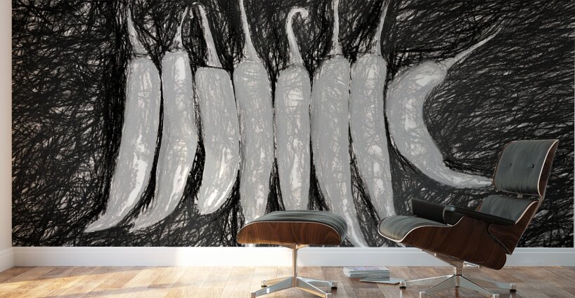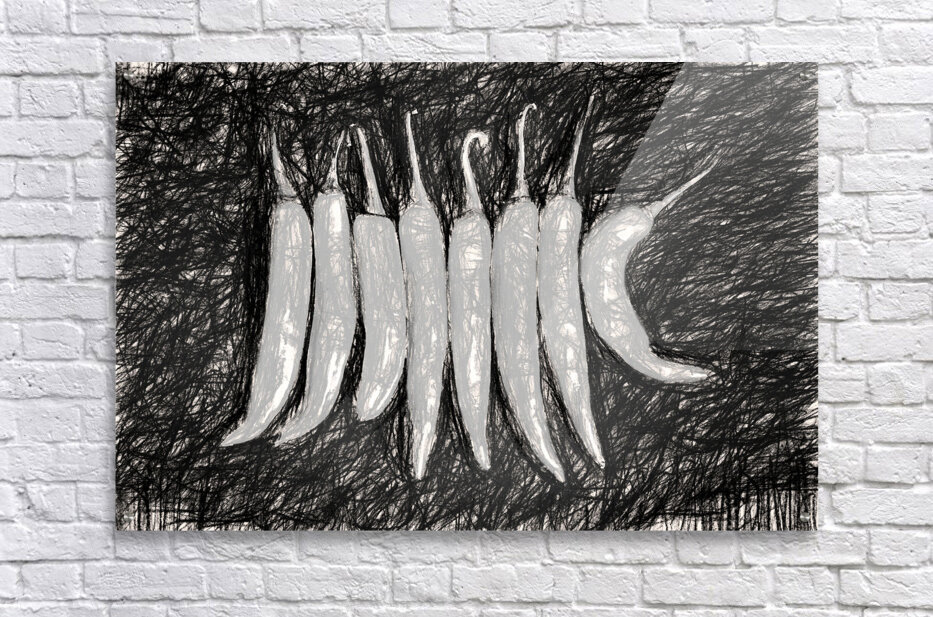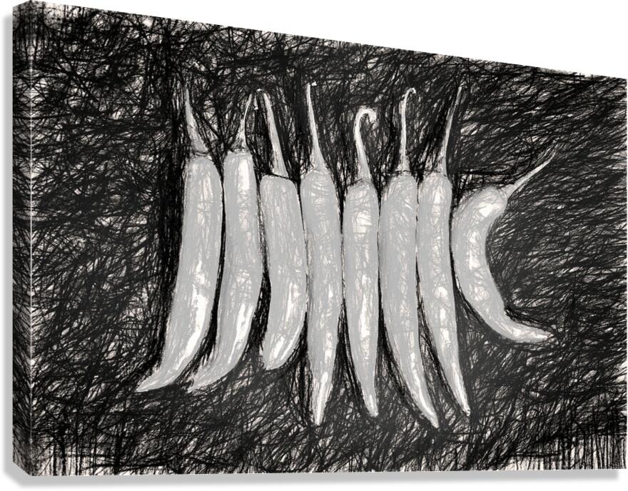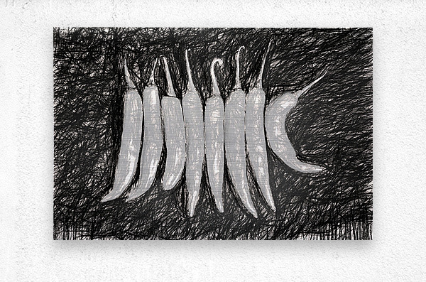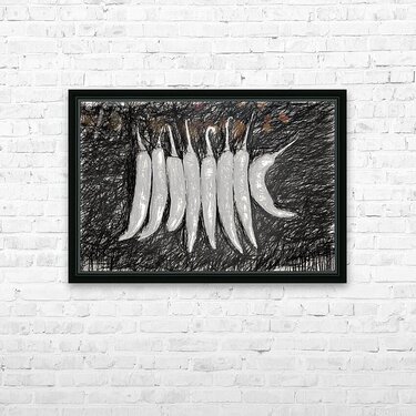 Drawn out scene of pepper vegetables in rough shades of black white and grey