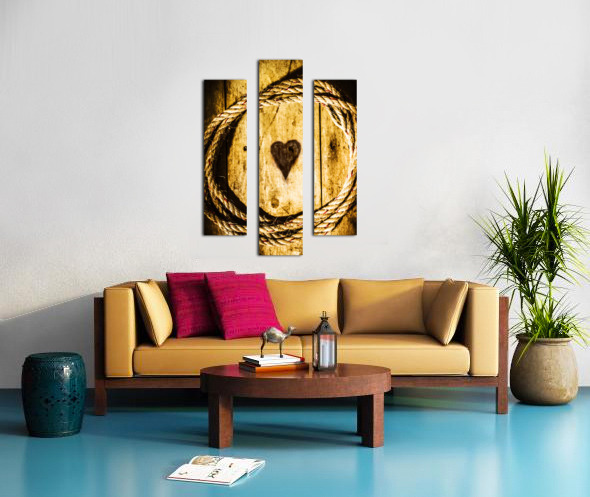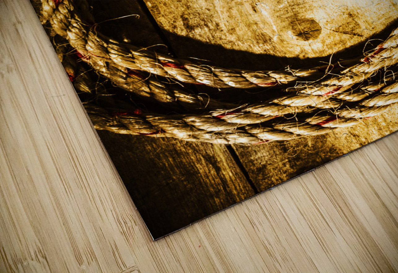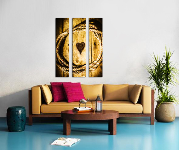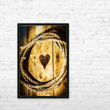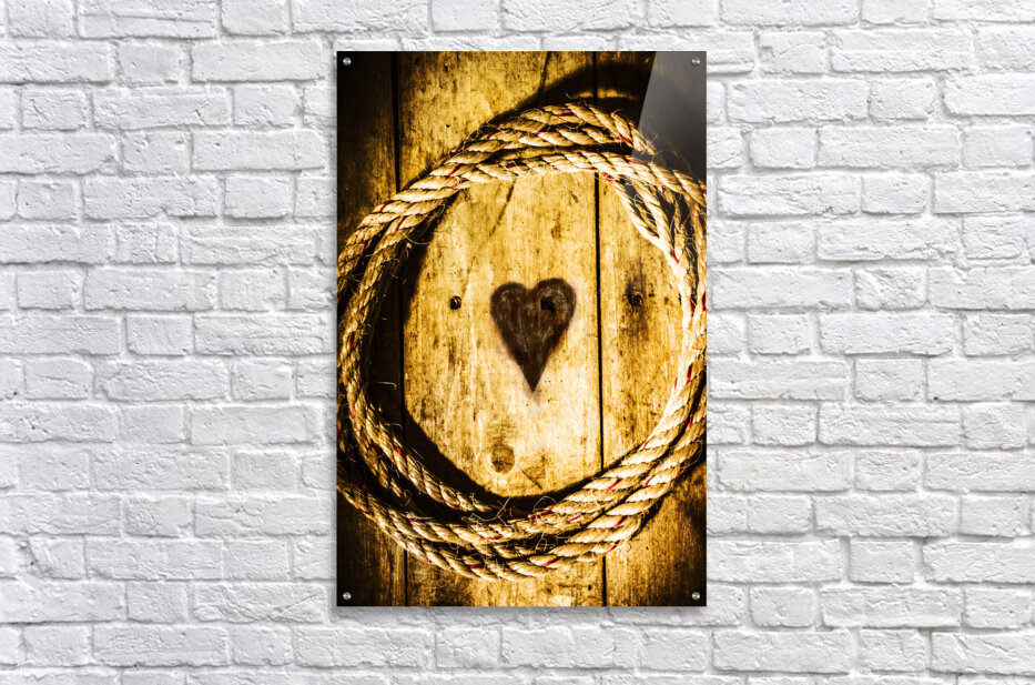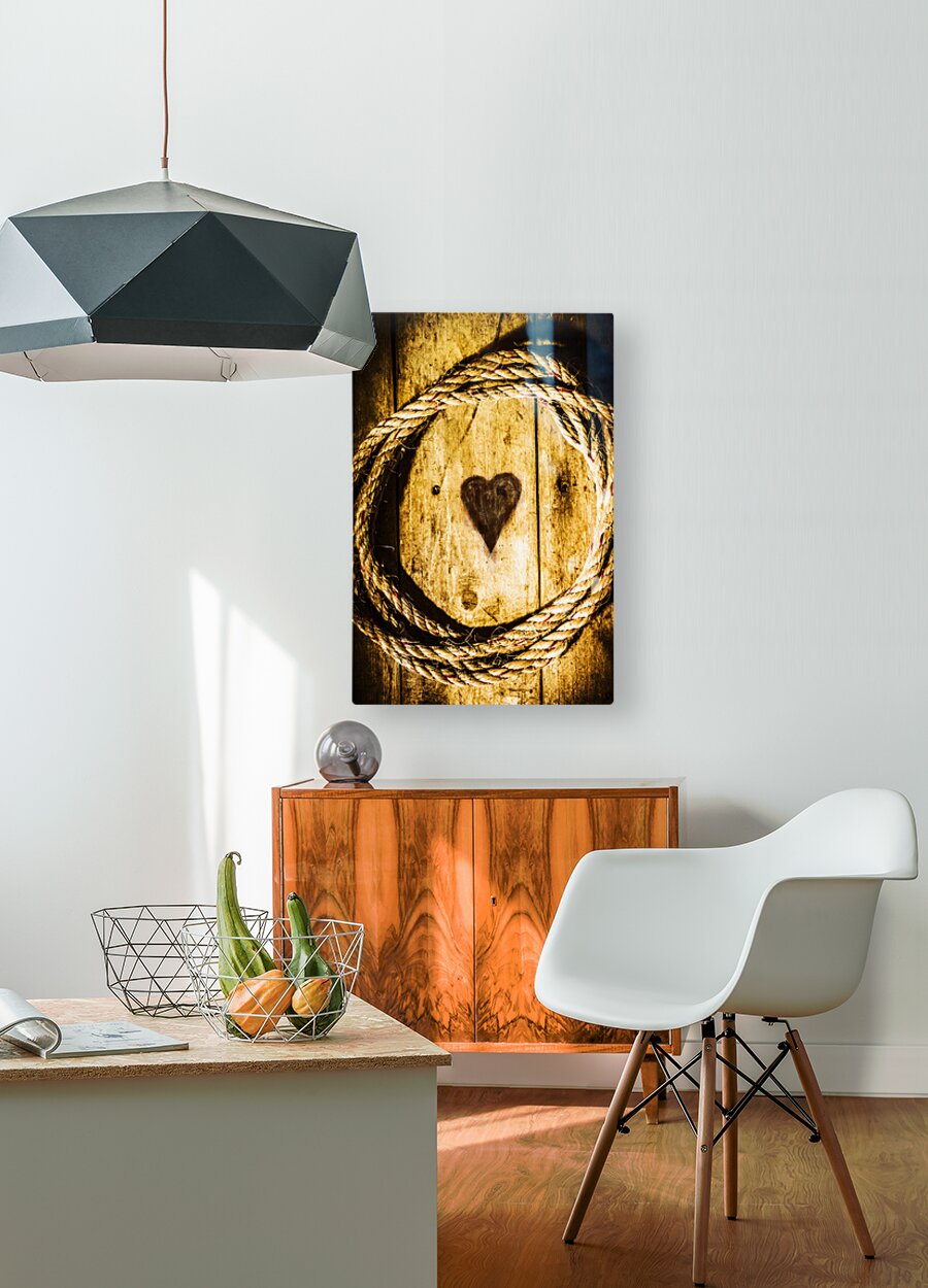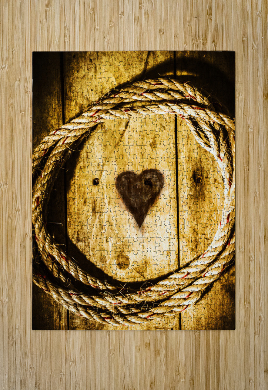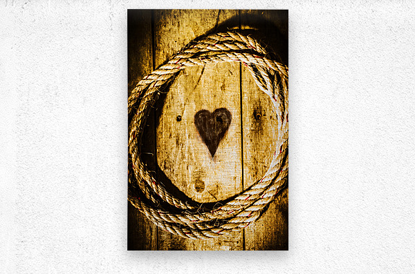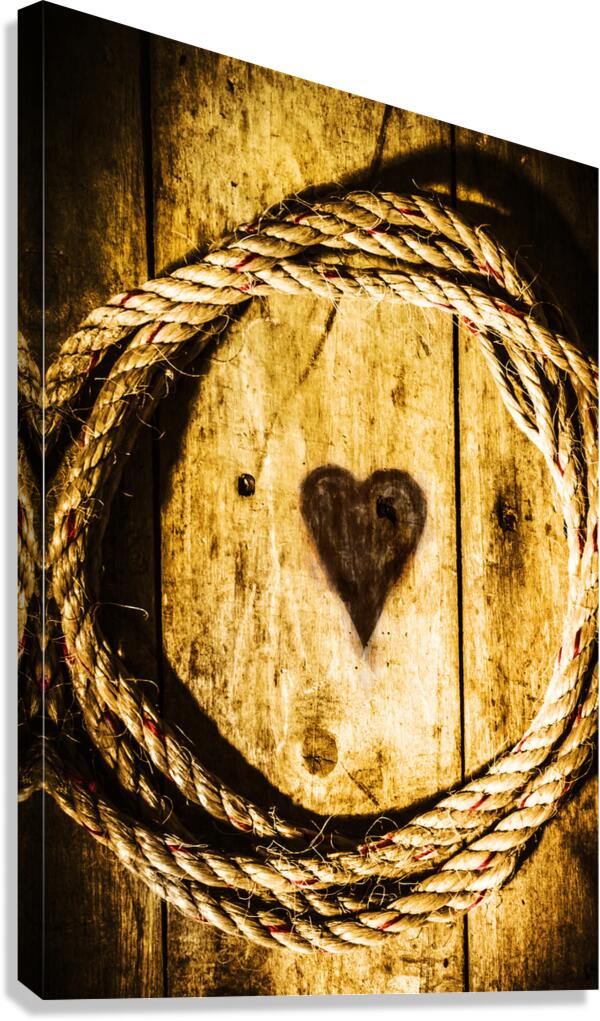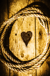 Symbol of maritime love etched in wooden surface surrounded by rope. Ship shape heart