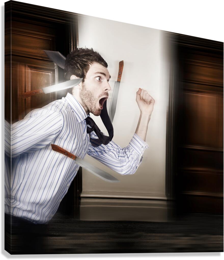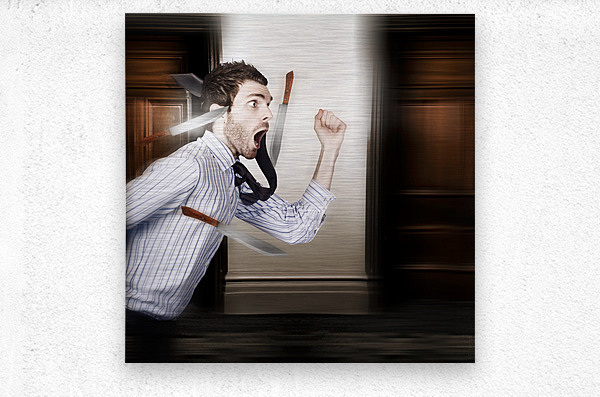 Crazy businessman running in a motion blur of speed and panic from flying sharp knives in a concept of business danger and risk office location