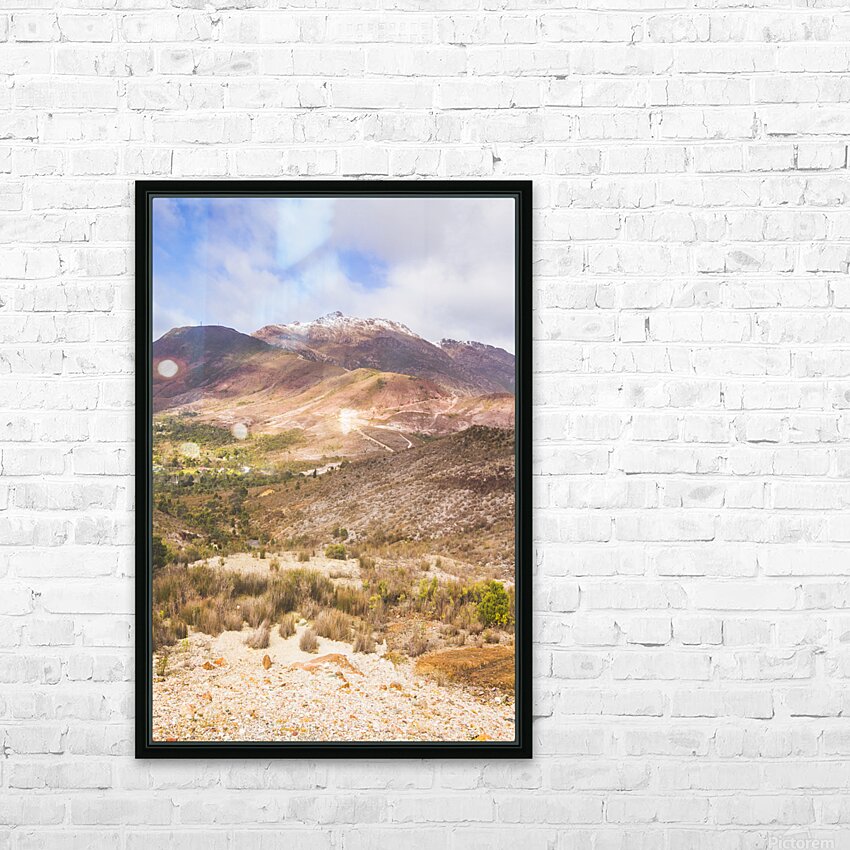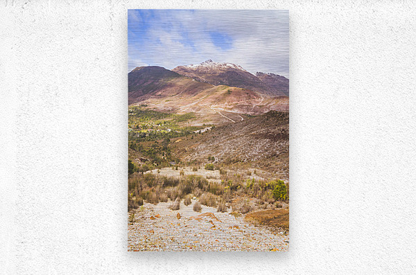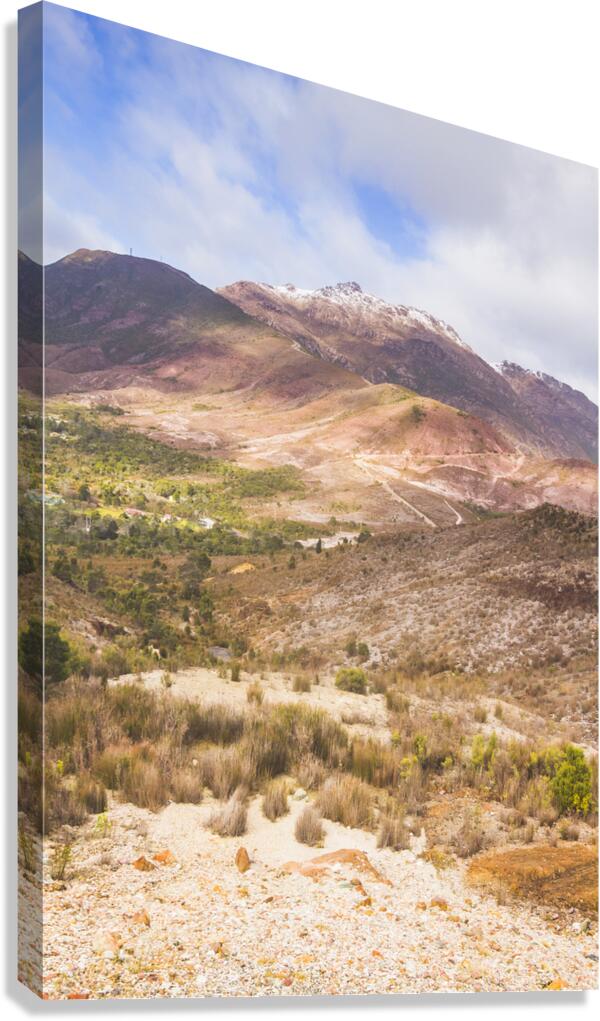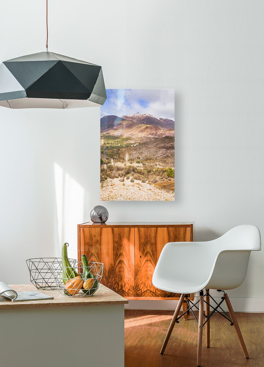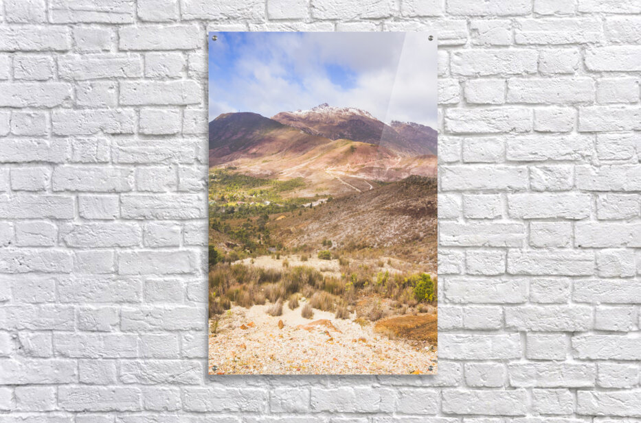Vertical landscape art on a rocky formation of valley villages and frosty mountaintops. Gormanston West Coast Tasmania Australia