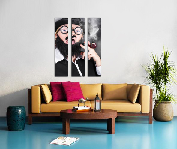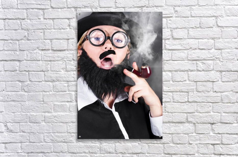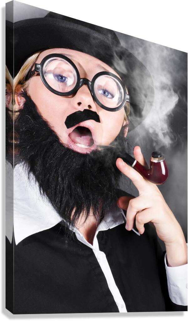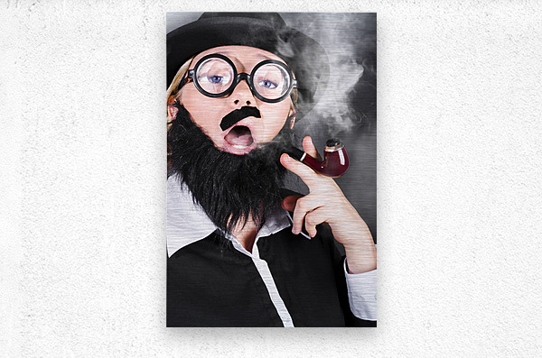 Comic portrait of a undercover private eye detective wearing nerd glasses and plastic moustache smoking pipe while conducting investigation