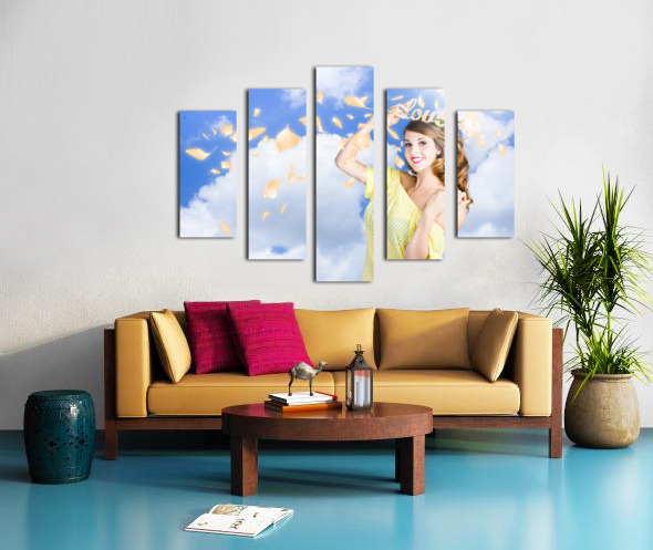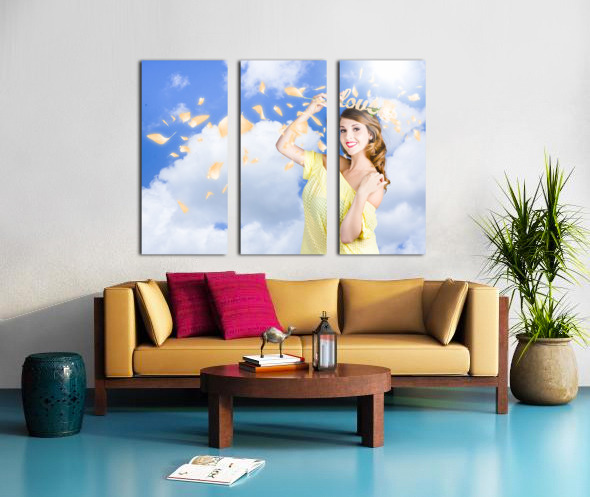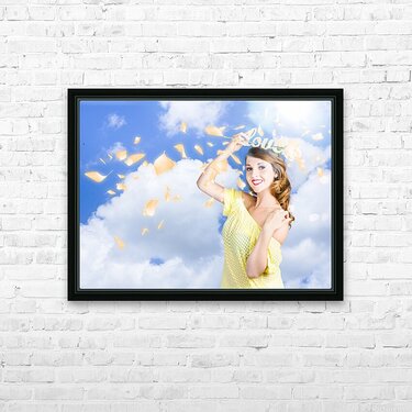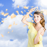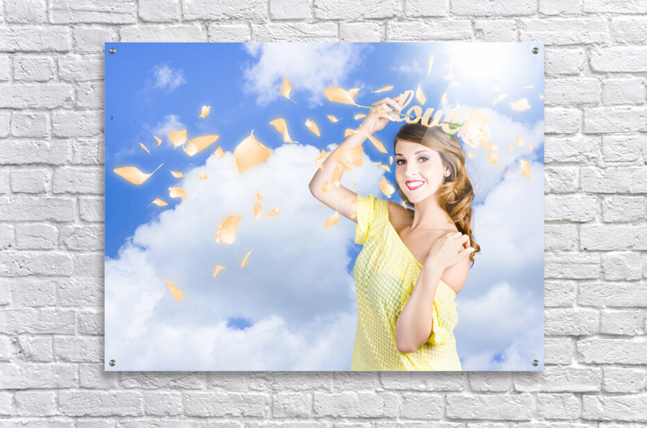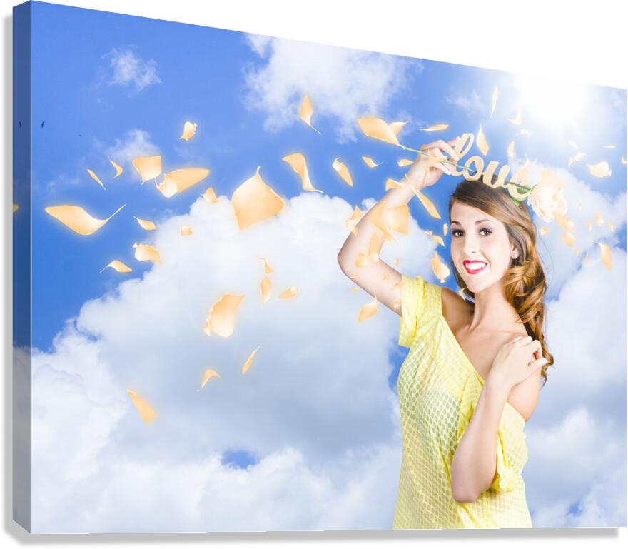Attractive young romantic woman dreaming of a sky filled romance amongst a shower of enchanting rose petals. Love and light