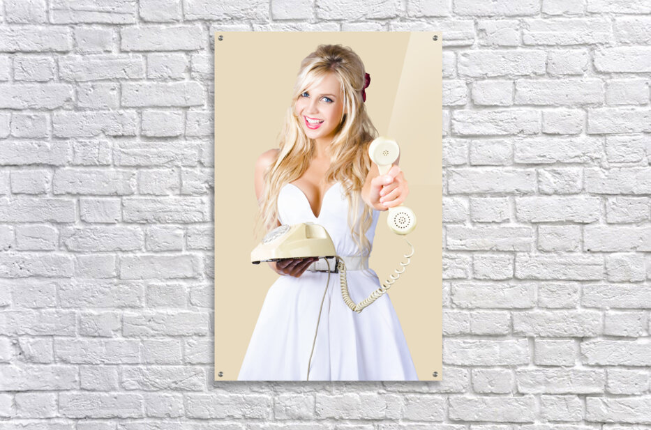 Smiling Woman with Retro Telephone Picture Frame Printing