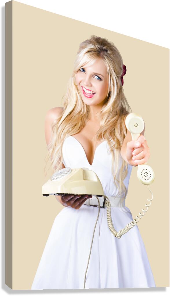 Pretty blonde young woman in white dress with old fashion corded telephone