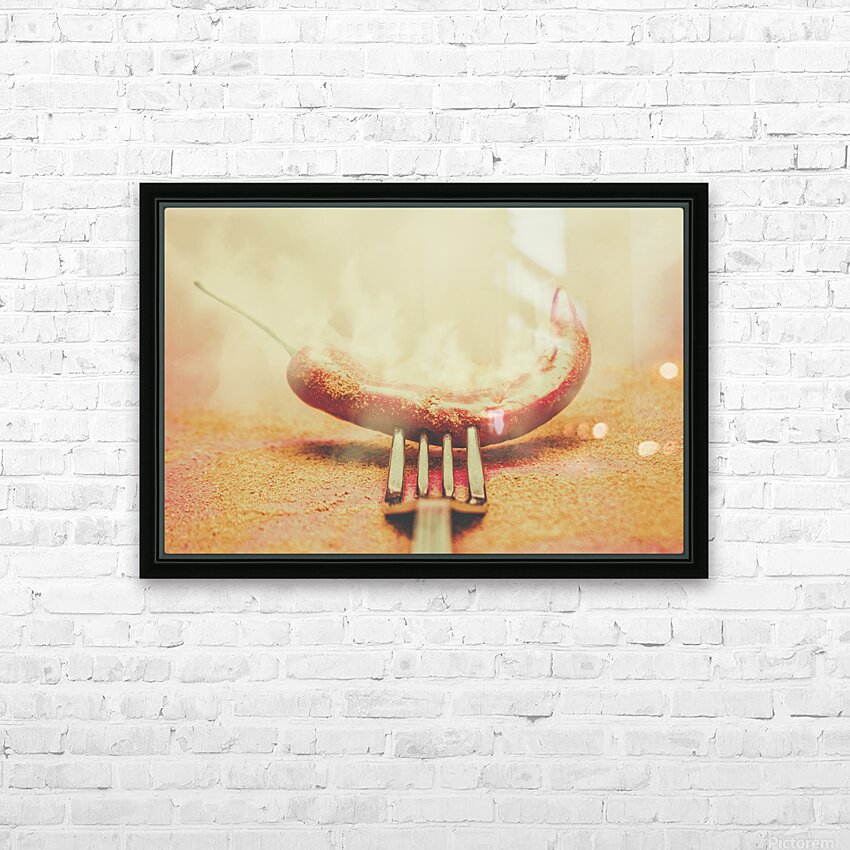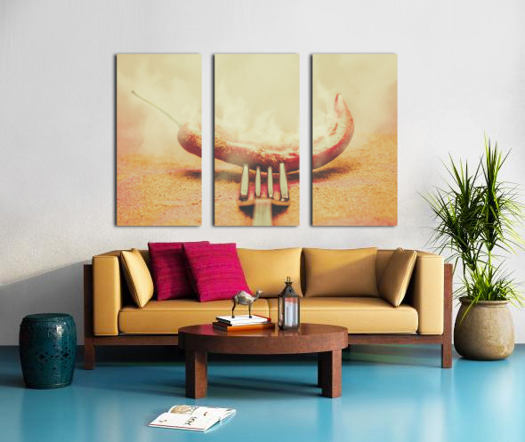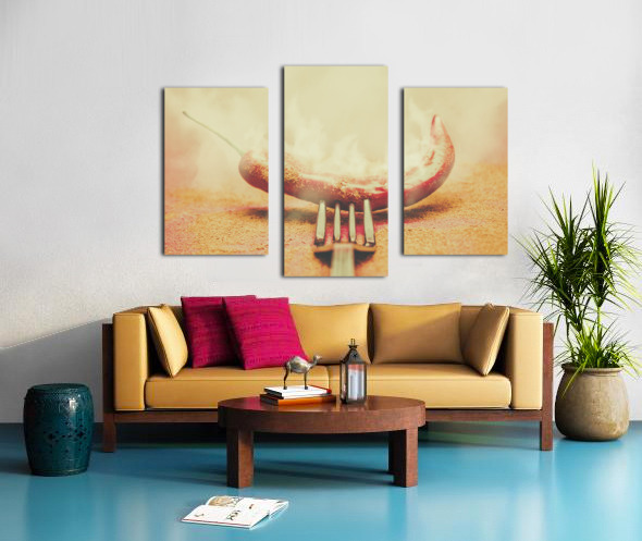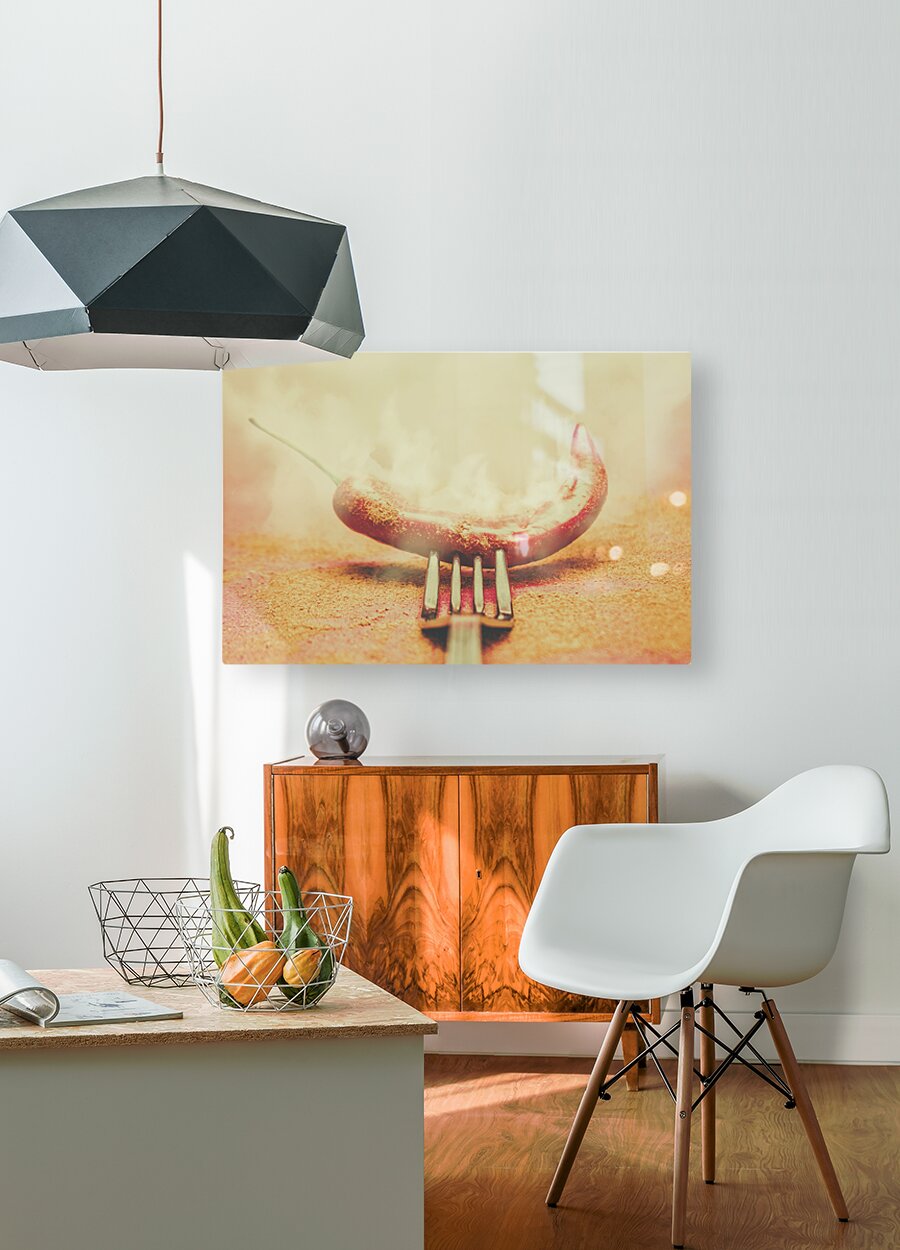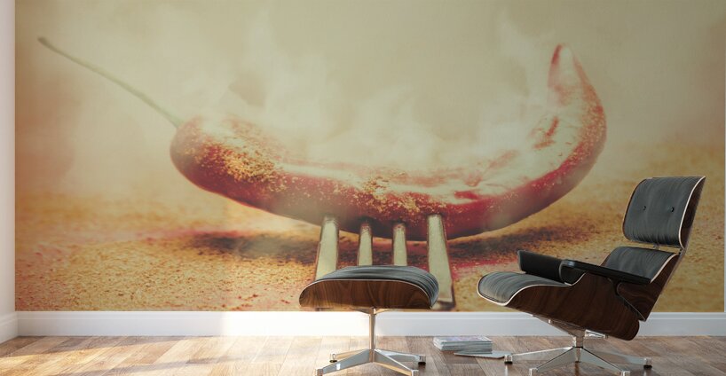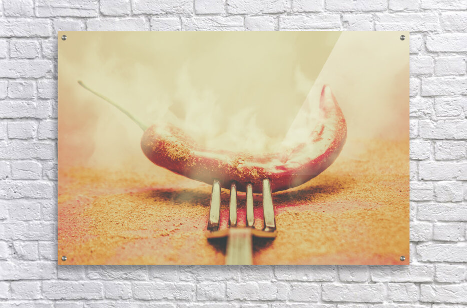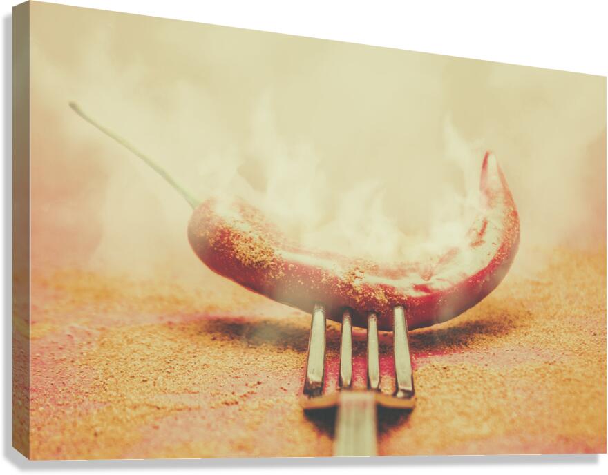 Artistic retro kitchen artwork on a smoking hot red chilli pepper on mexican restaurant fork. Organic heat