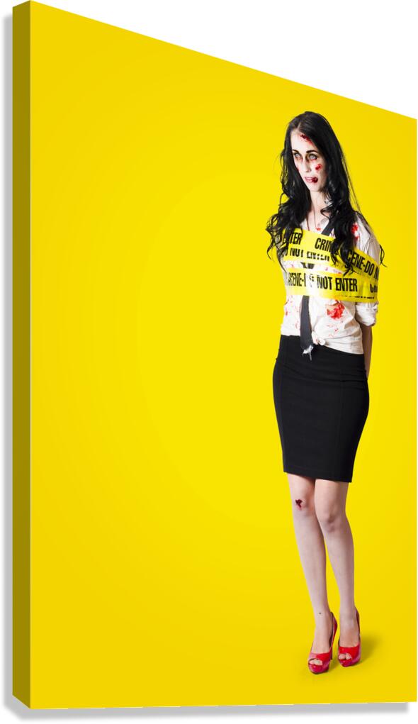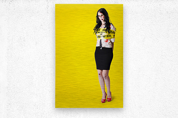 Frightening portrait of a departed homicide victim standing wrapped in crime scene tape on yellow background