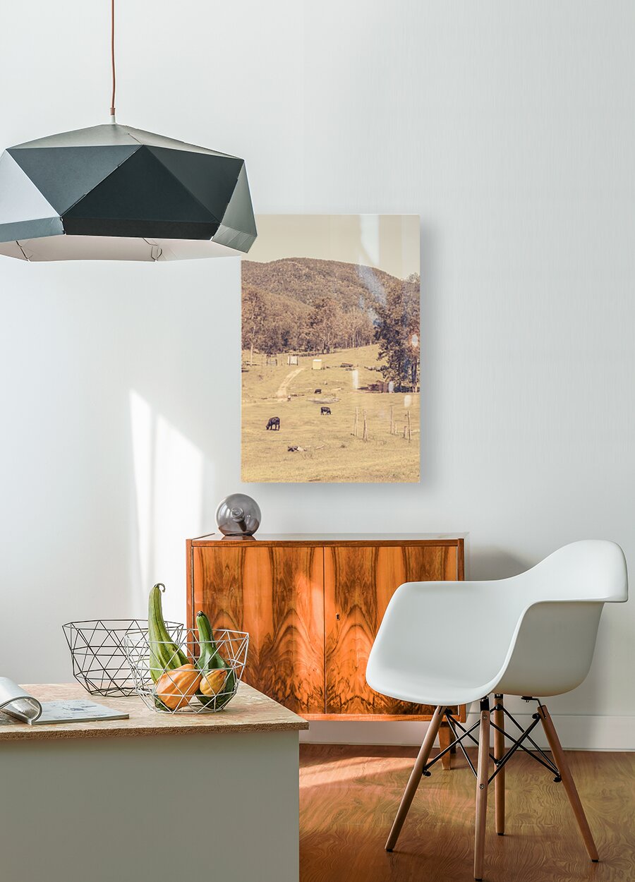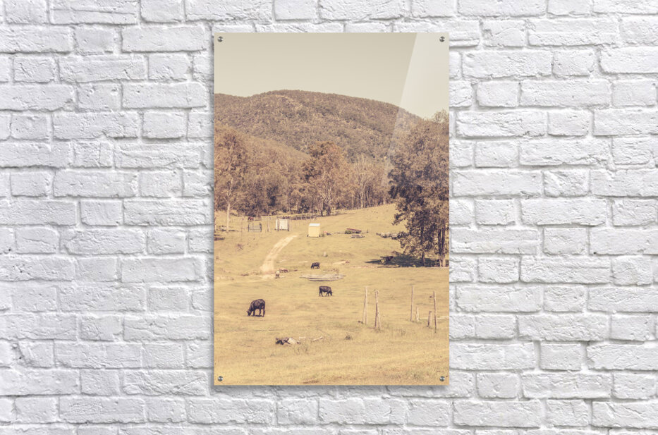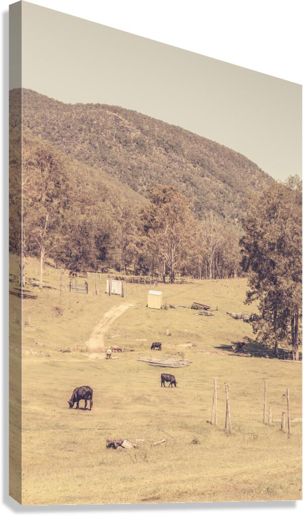 Vintage landscape of cattle country with fields and cows in sparse antique farmlands. Mt Perry Queensland Australia