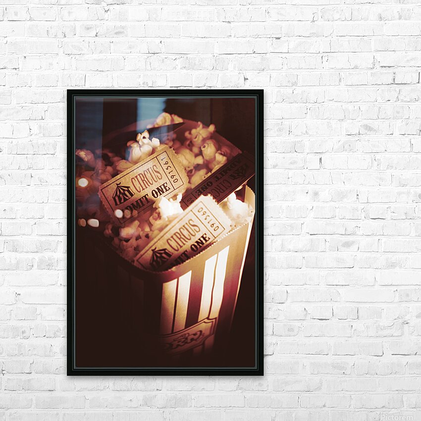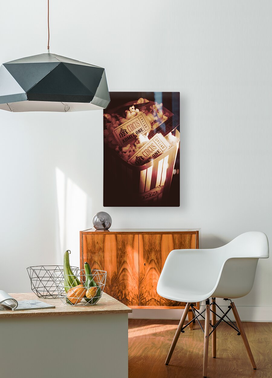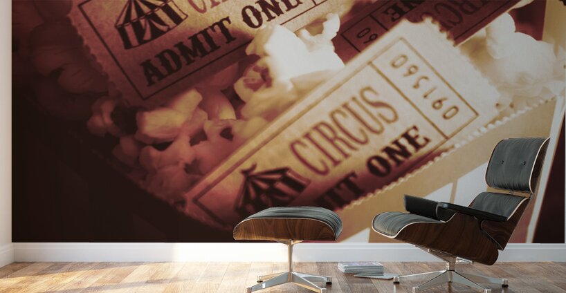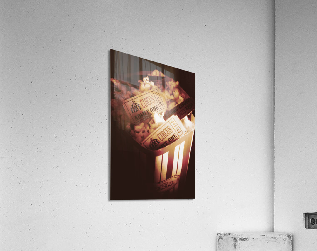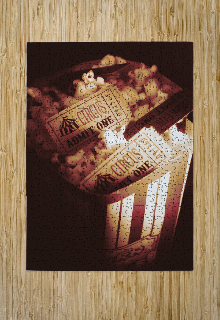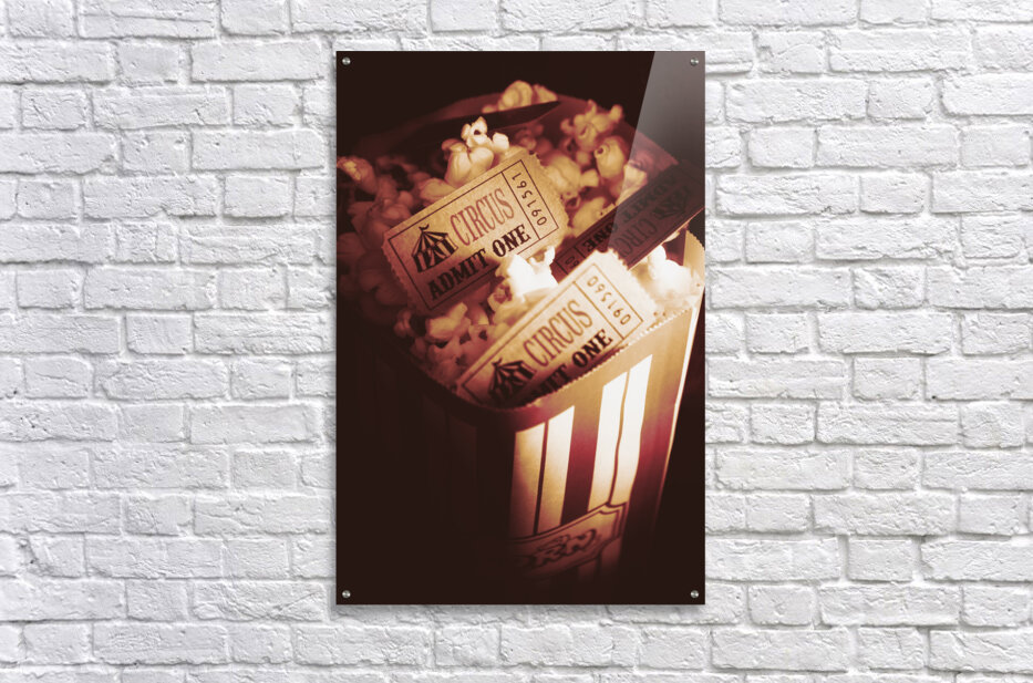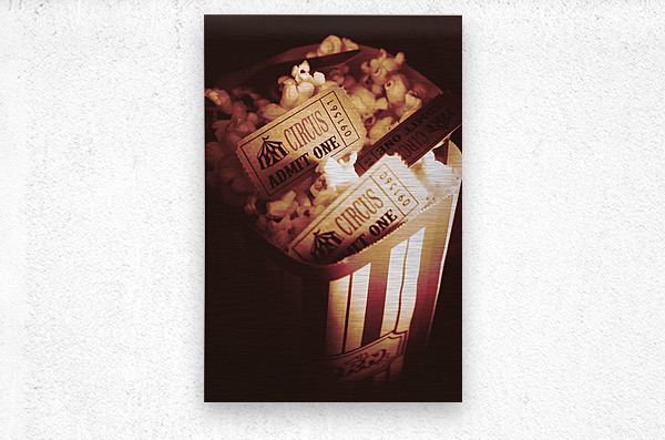 Carnival fun in a retro still life scene of striped snack bags and big top admission slips. Midnight circus