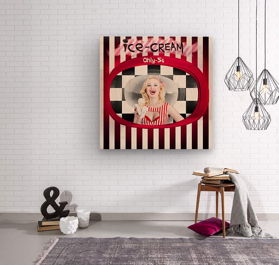 Beautiful blonde woman serving ice cream  Wood print
