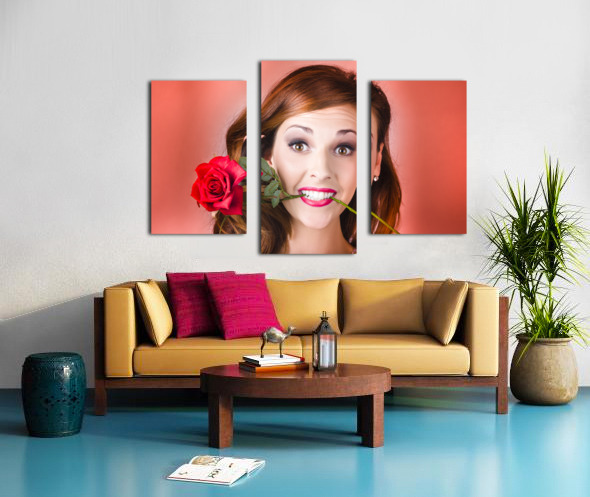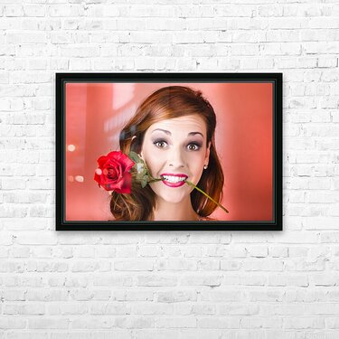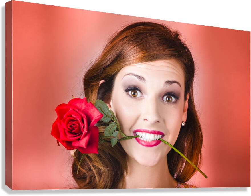 Woman gripping red rose between her teeth Picture Frame Printing