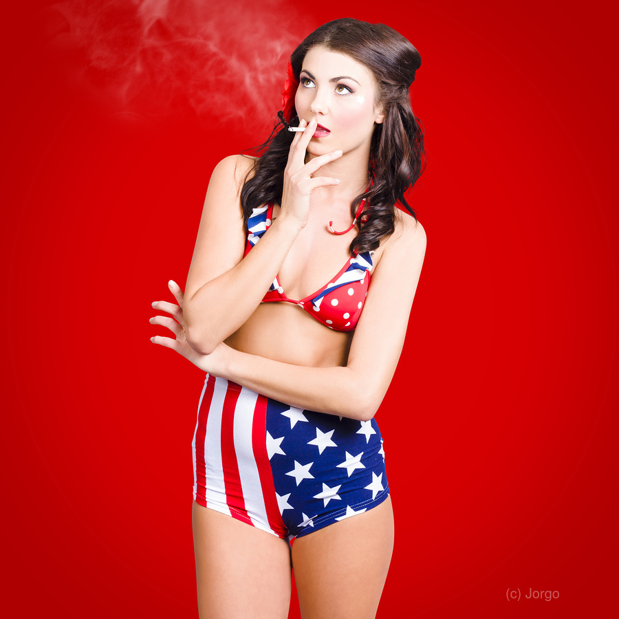 Attractive USA pinup woman smoking in lingerie with edgy style on red background