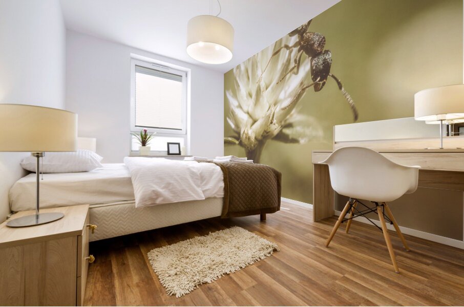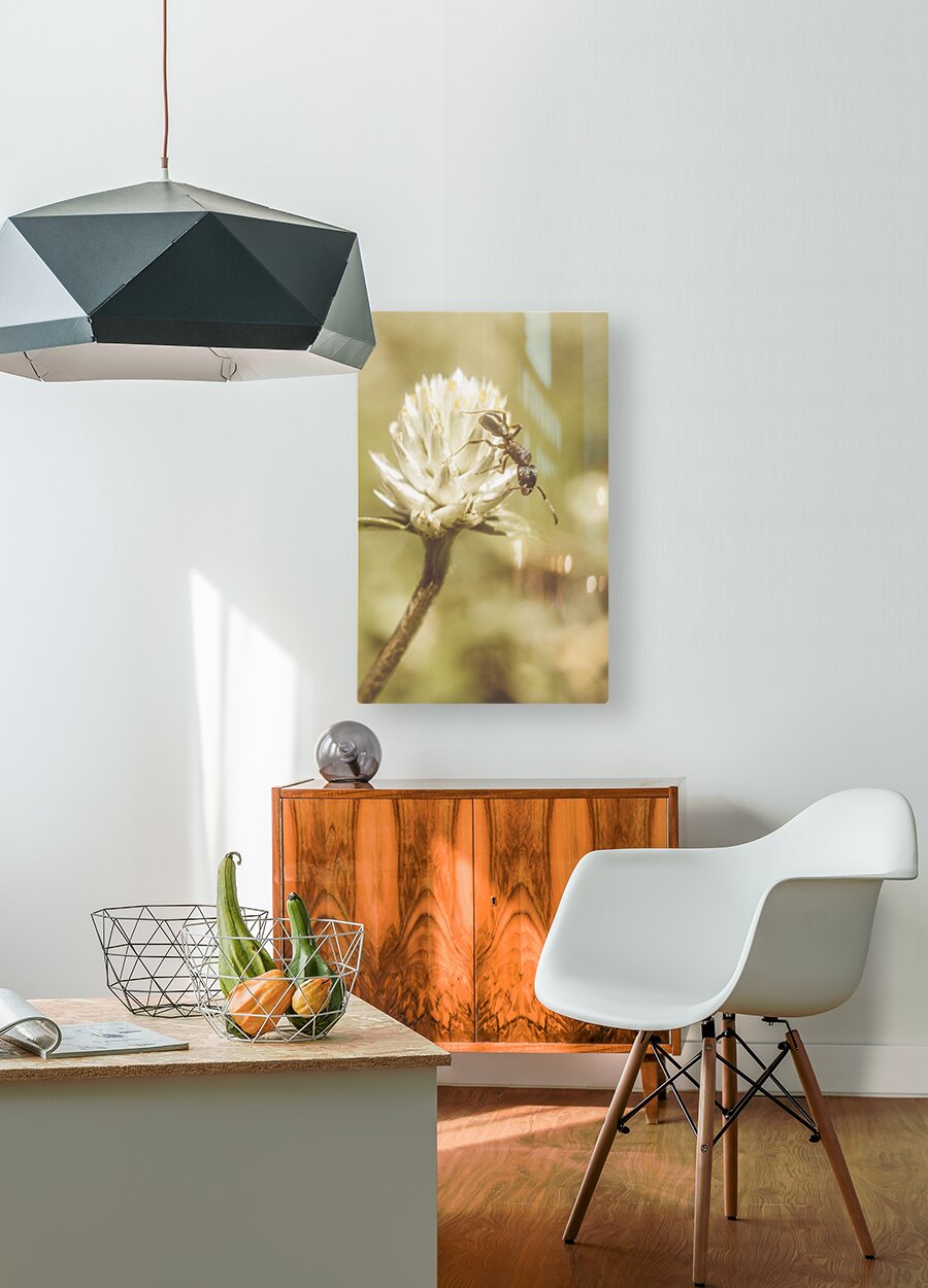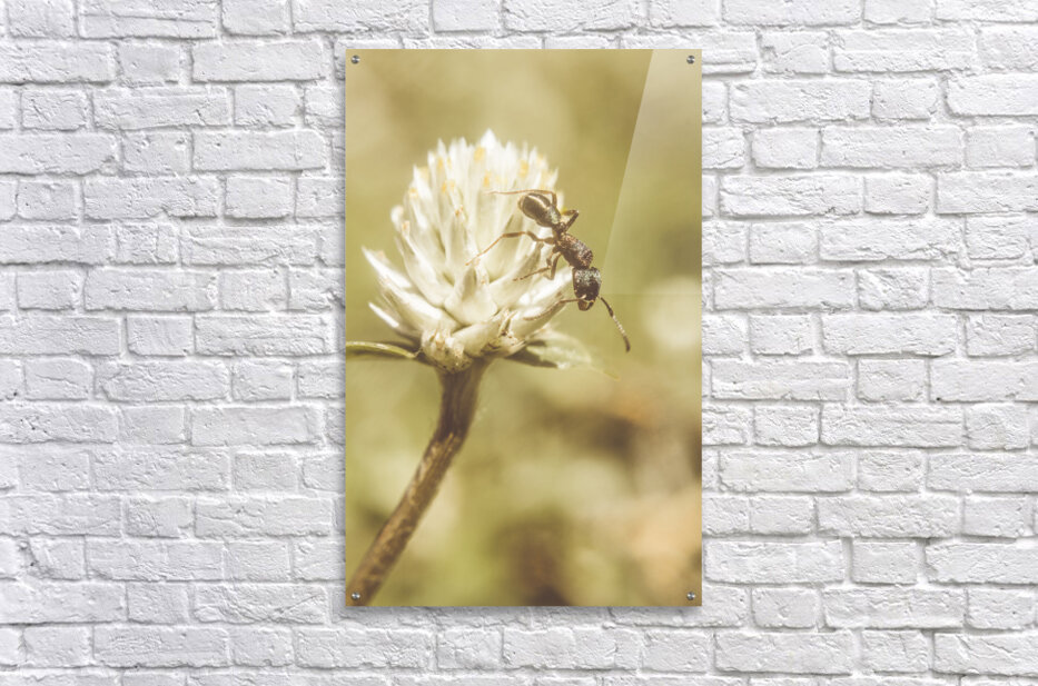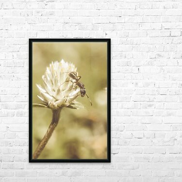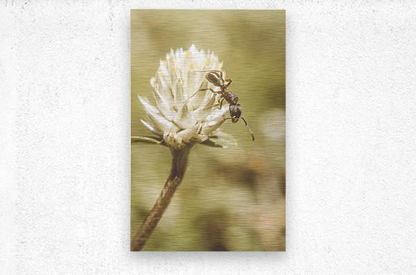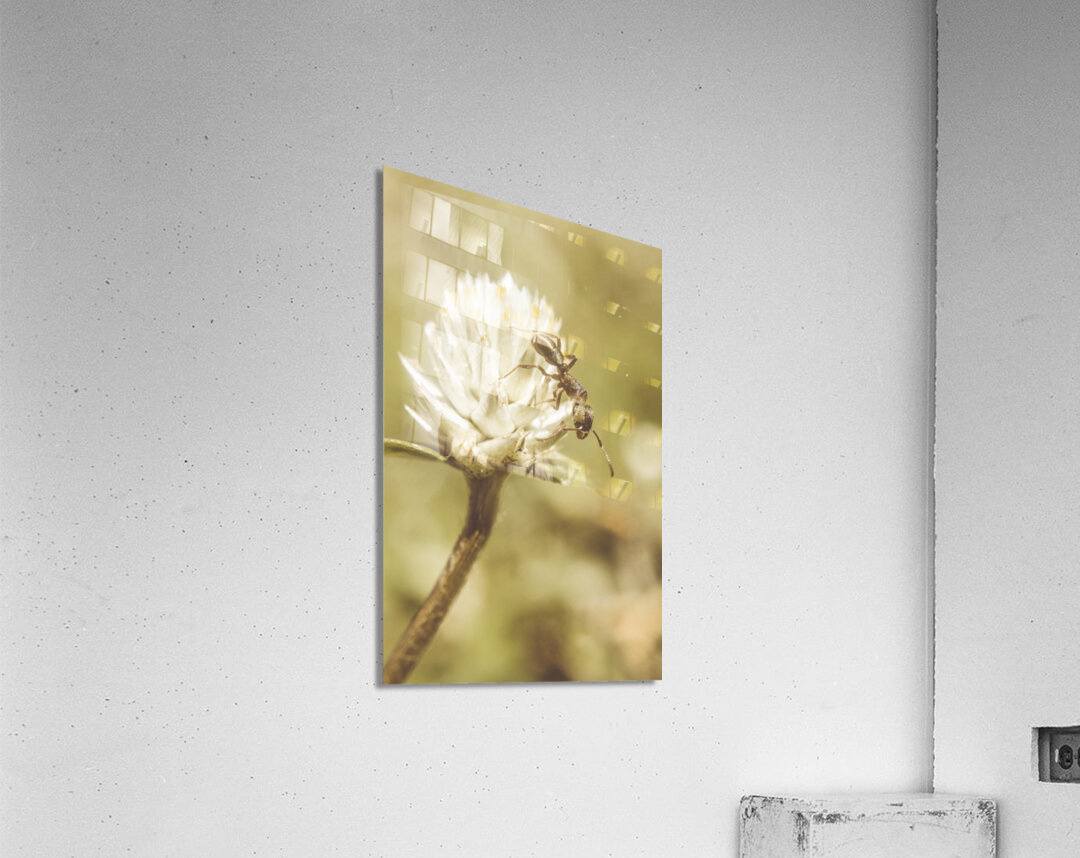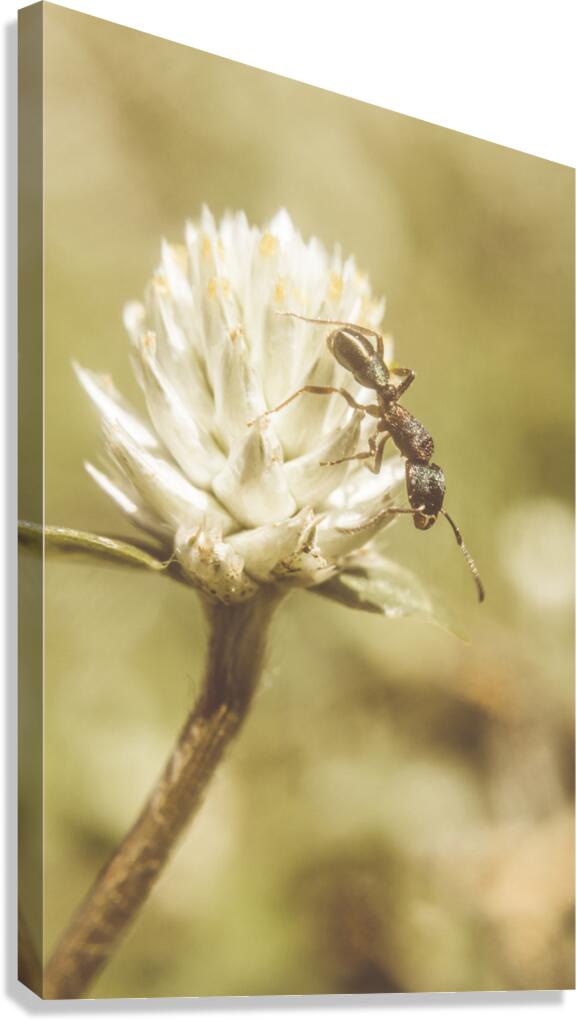 Vintage macro photo on an ant scaling the tips of a wildflower clover. Ant-ique
