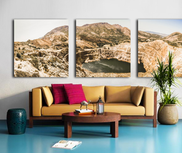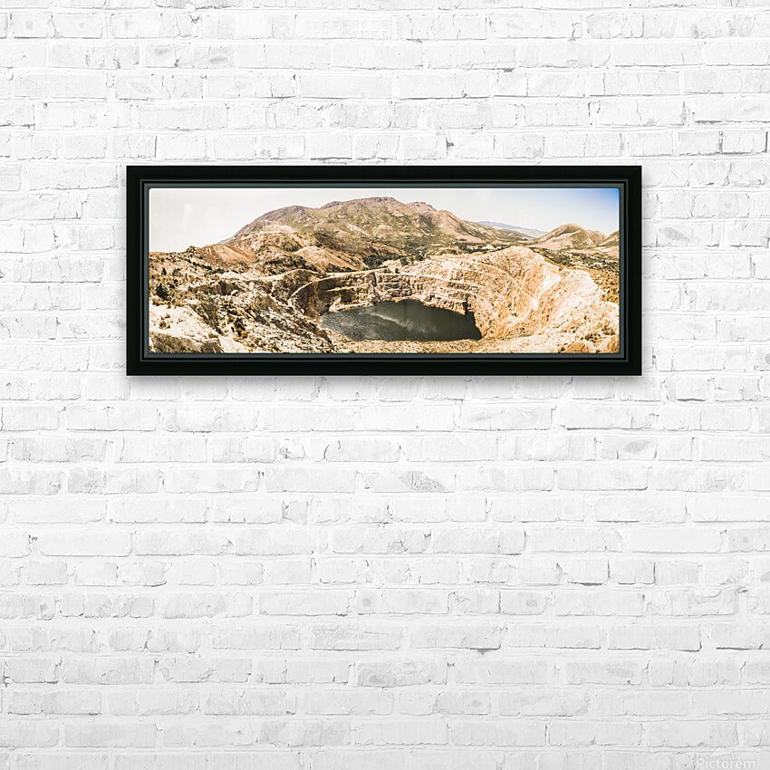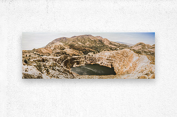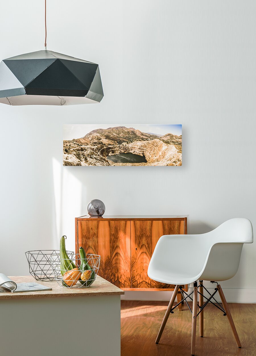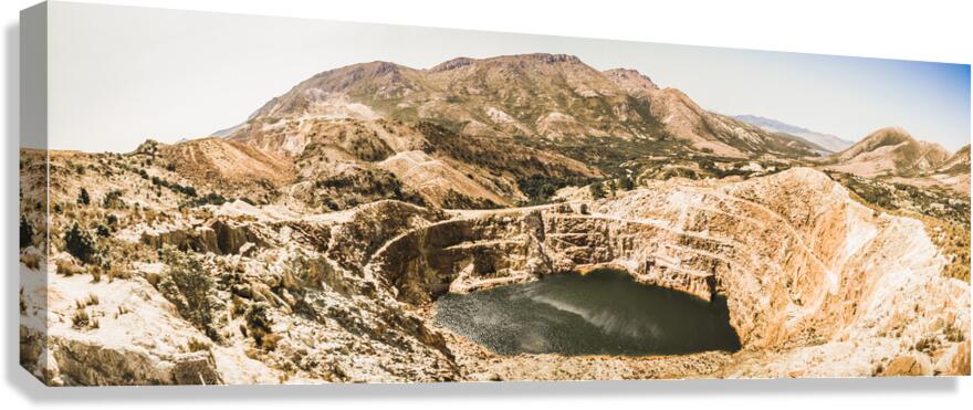 Vast expansive panoramic of old industry with a quarry in open-cut excavations. Iron Blow Lookout Gormanston West Coast Tasmania Australia