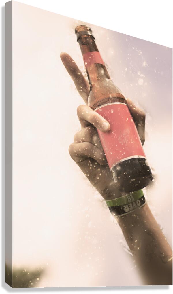 Photograph on the hand of an fan making a point with beer bottle in hand while in the crowd at an over 18s rock music concert. Salute to beer drinking songs