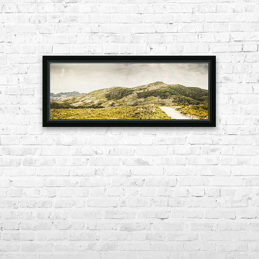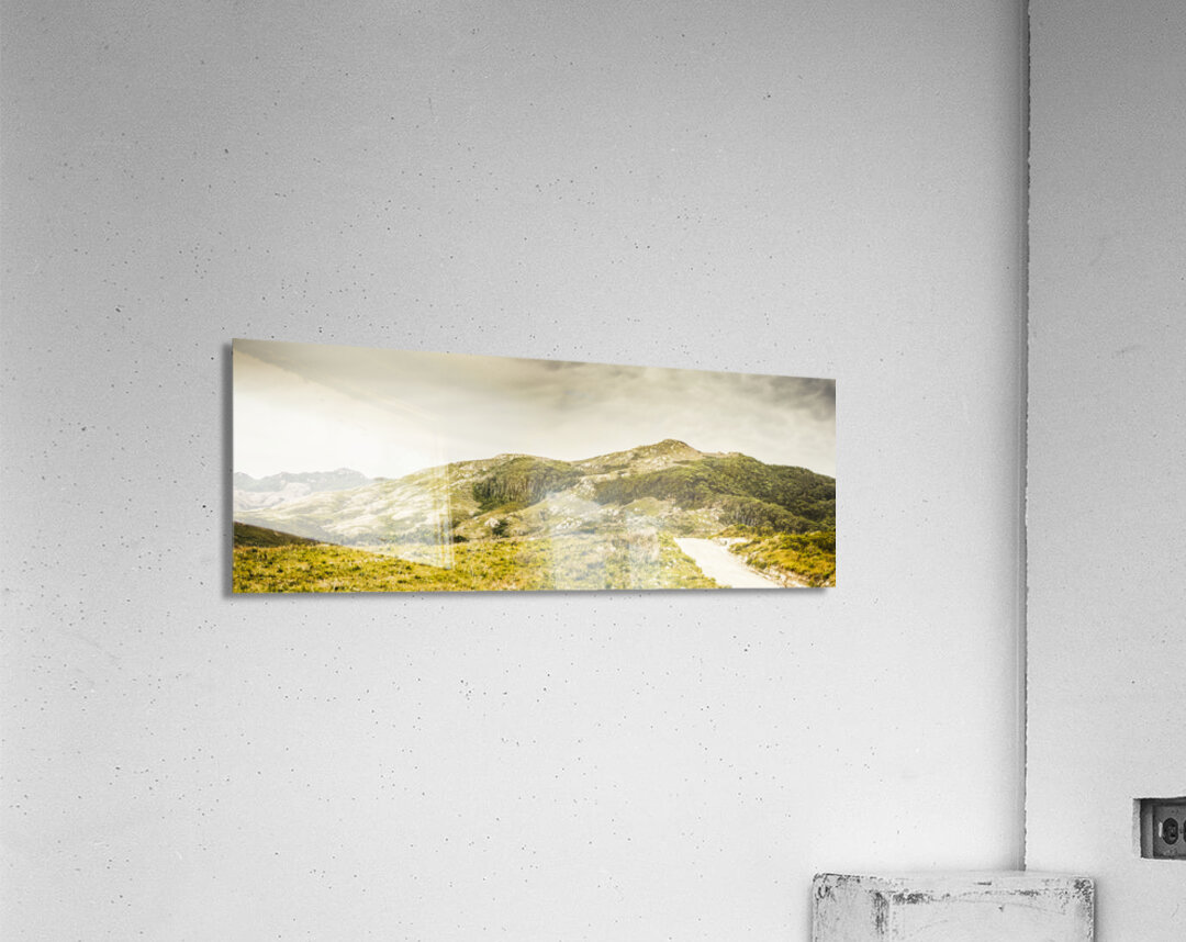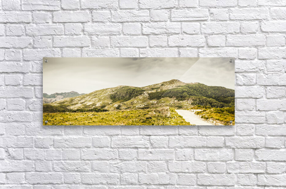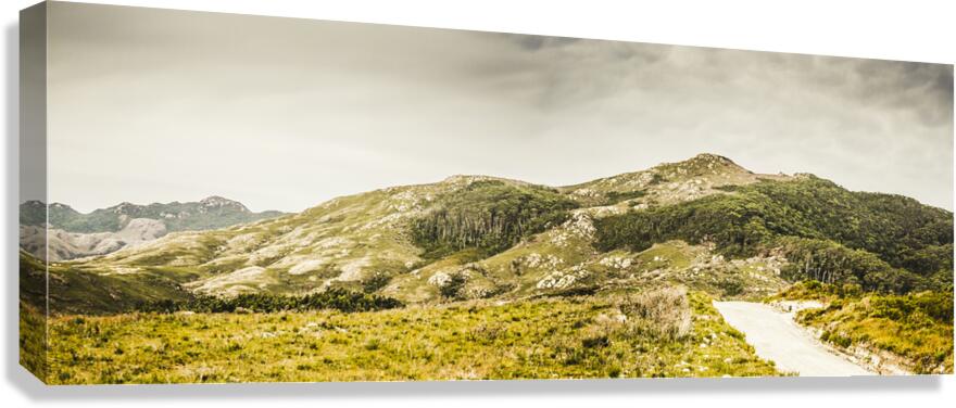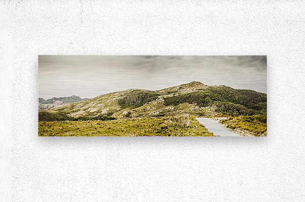 Rugged rural panoramic landscape on a scenic country road winding beside spectacular mountain ranges of Trial Harbour Western Tasmania Australia
