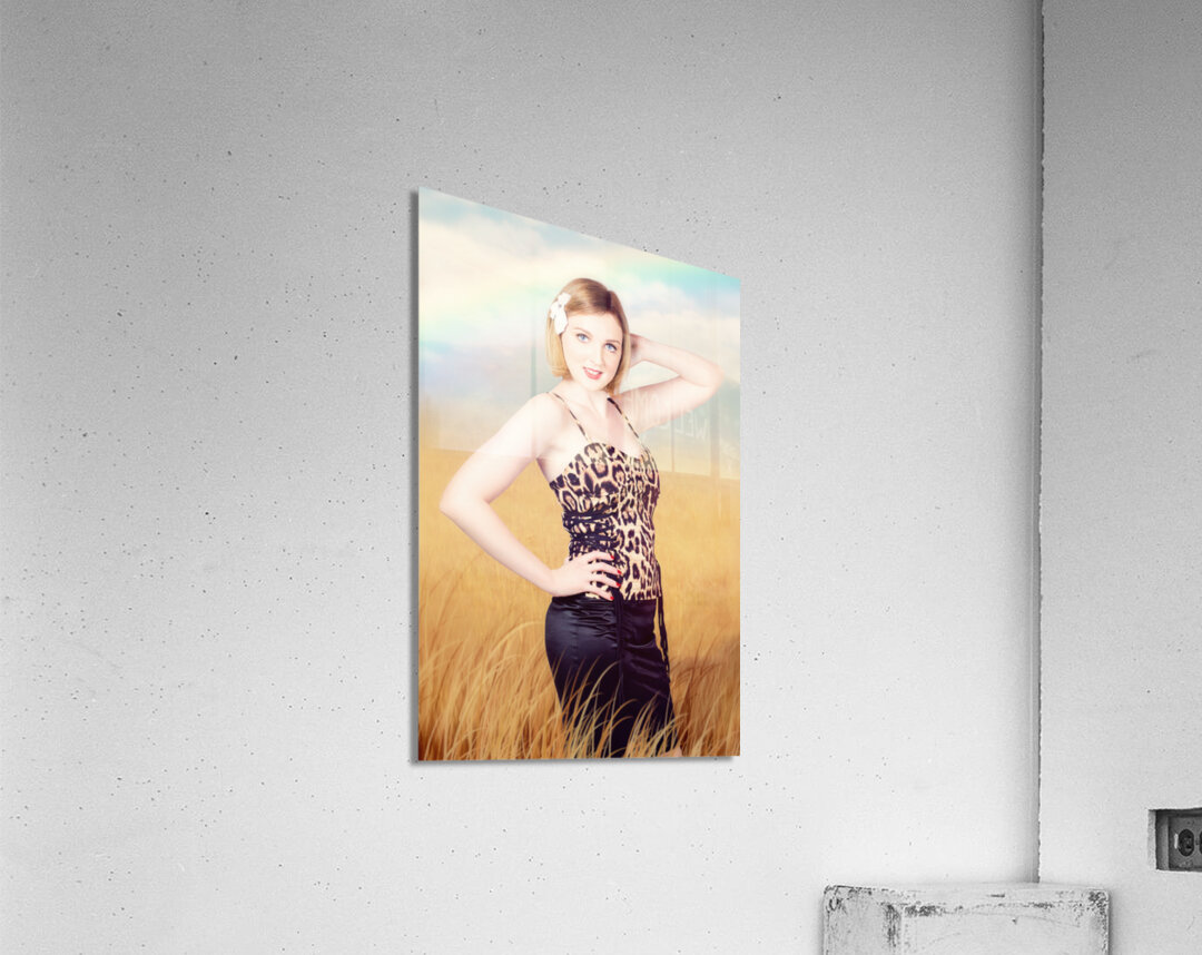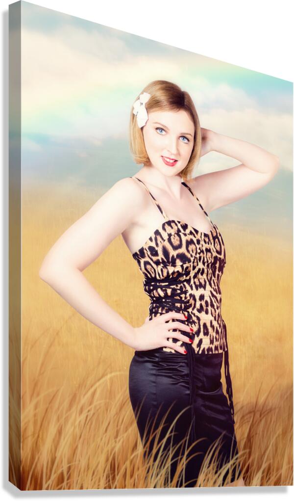 Africa safari pin-up woman with short blond hairstyle walking on a dreamy illustration of African savannah grassland. South African holiday adventure